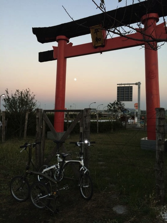 例の赤鳥居!向こうに満月が見えます!