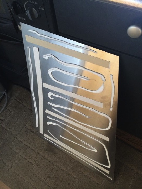 ステンレスヘアラインプレートに、のりと両面テープをくっつけて