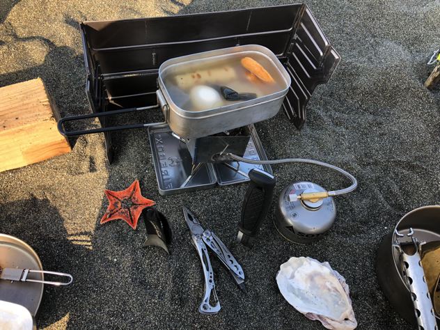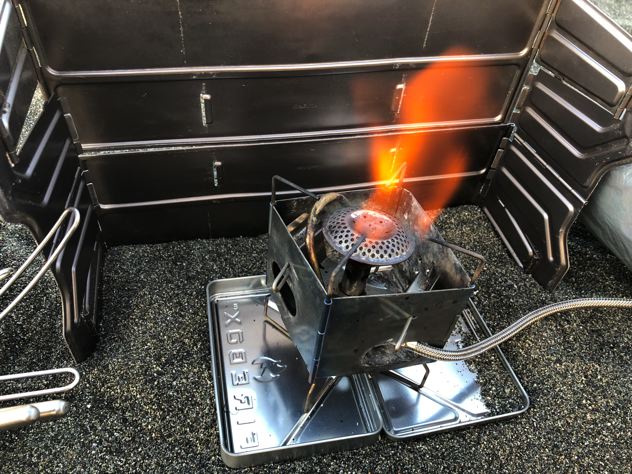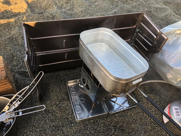 風が強くてもテーブル風防が効いててメスティンでお湯を沸かして・・・