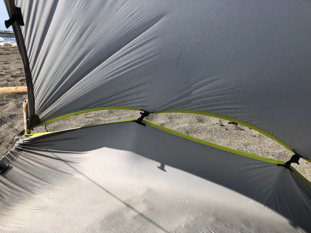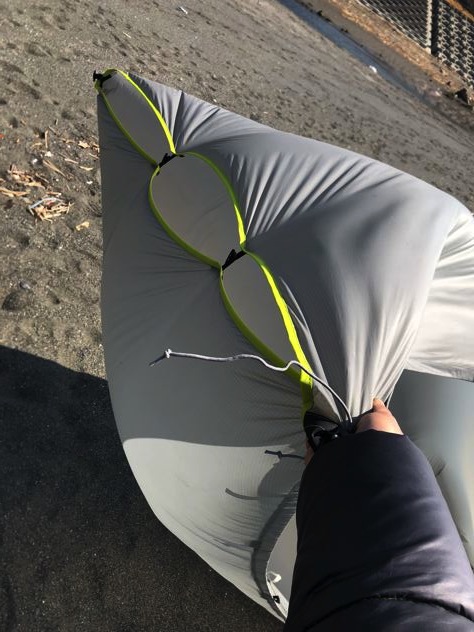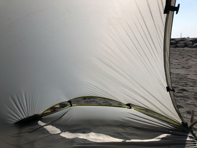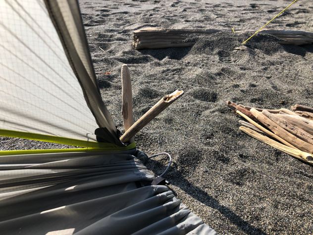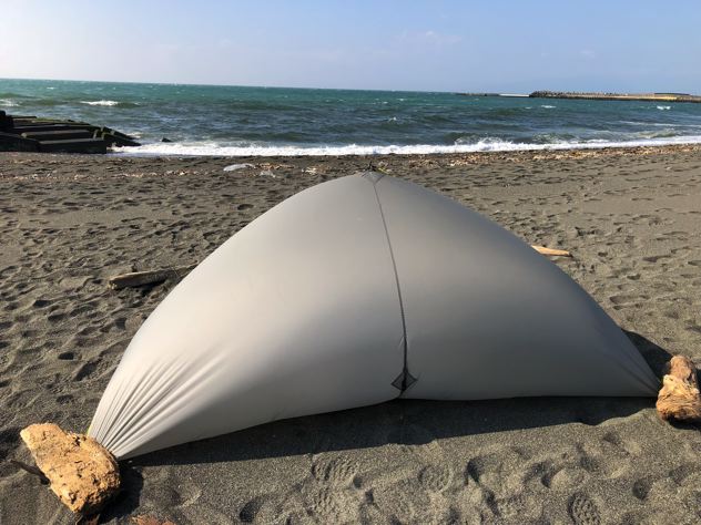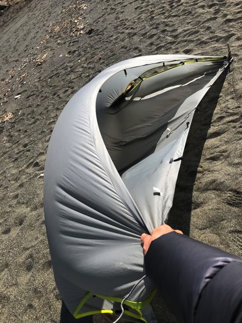自分の体重と荷物の重さでなんとか凌ぎますが飛ばされそう。泣