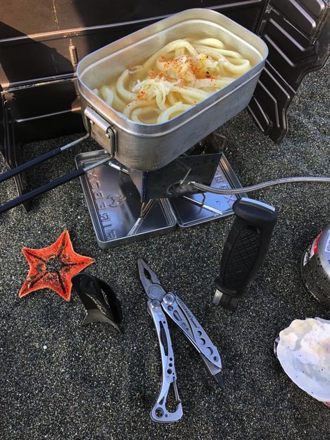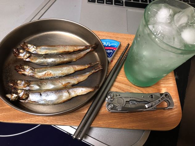 レザーマン見つめながら、シシャモで芋飲ります。うみゃ〜!