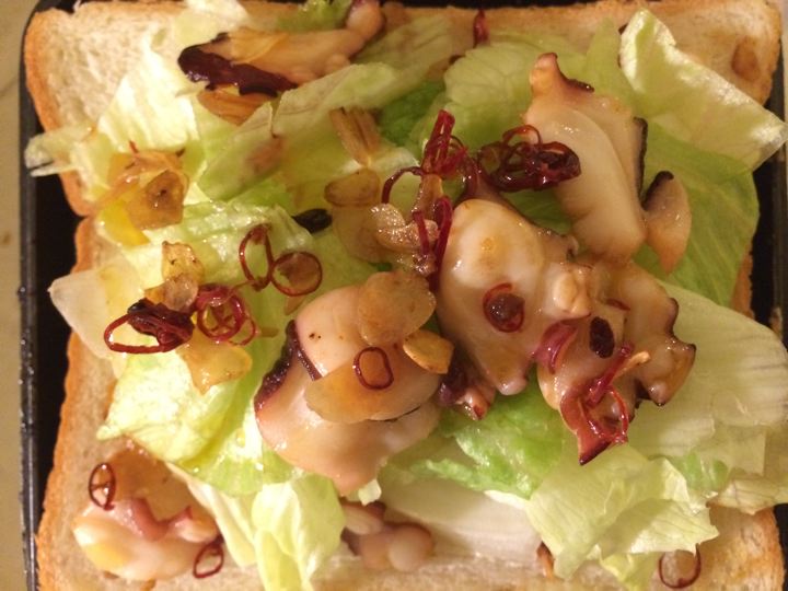 キャベツ敷いてタコペペロンのせて鷹の爪!