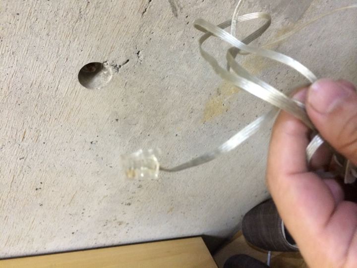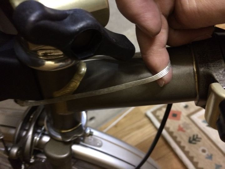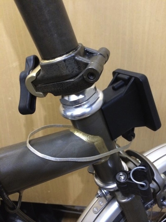 フロントキャリアブロックにバッグをつけた時にリリースしやすくする「たづな」を何でやるか?考えた挙げ句、普通はレザーとかが定番ですが・・・、Rawカラーらしく、電話用のスケルトンケーブルでやってみる事に。