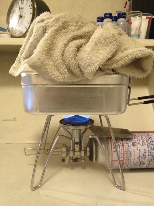 ふきこぼれがあるので、黒川紀章デザインのデスクがばばっちくなるから、トイレで点火!