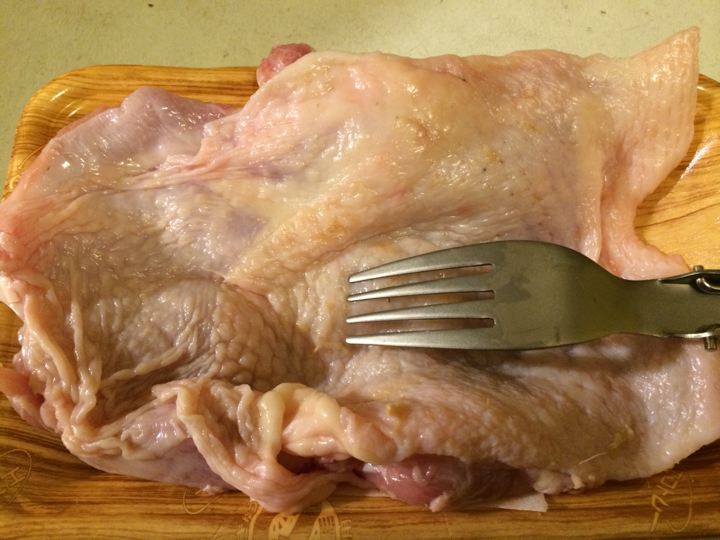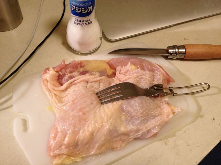 鶏皮にぶすぶすぶすと穴をあけて塩をこすりつける。