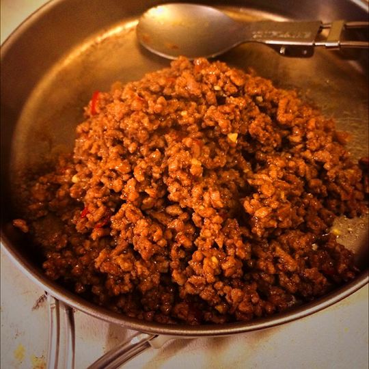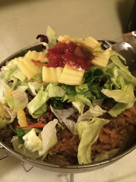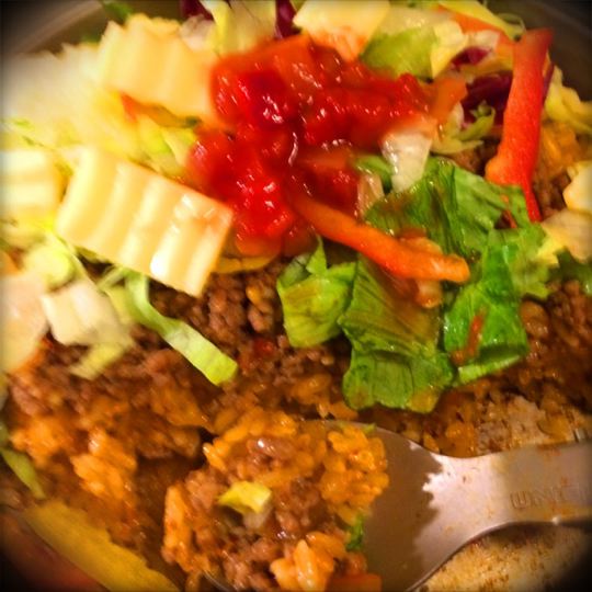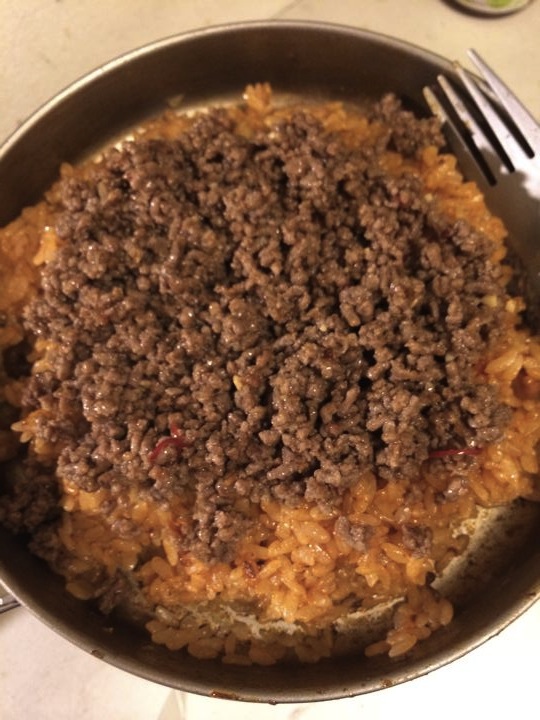 ご飯をメスティンから盛り換えて、タコライスの元をまぜまぜ・・・