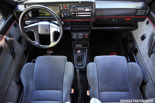インテリア。Golf5から始まったデザインの延長線上にありますね。メーターが280km/hまでしかないのは残念。はったりでもいいから300km/hにしてください!