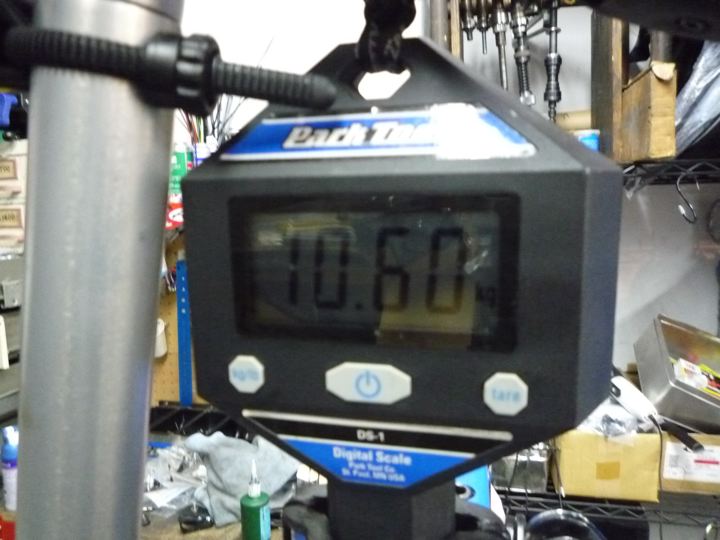 O-dotサスとサイコン装着後、再び体重測定。10.6kg。