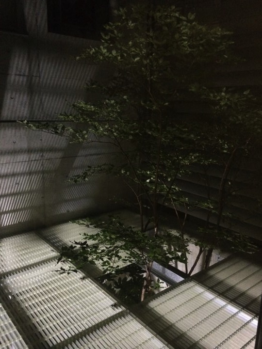 夜は光庭を下からライトアップして、初めてプリーツ網戸を使用。