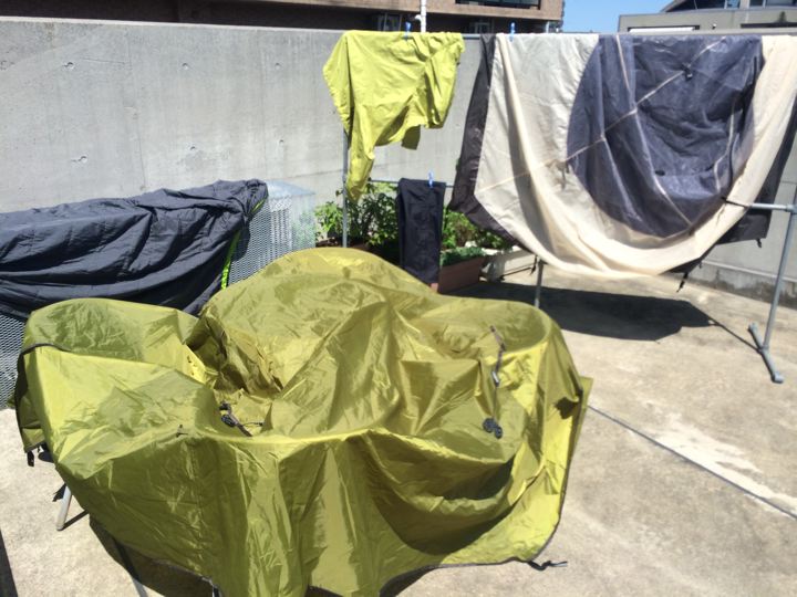 後日晴れの日に屋上でテントを干す。
