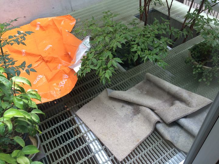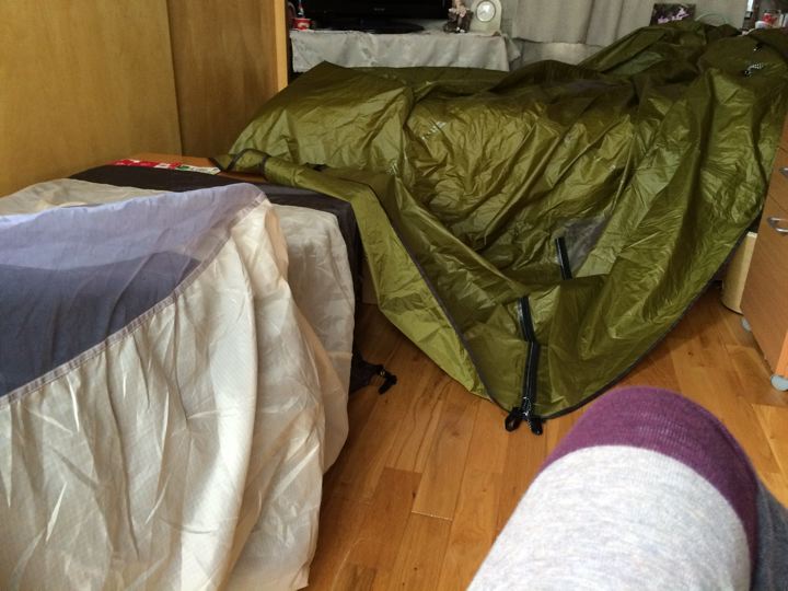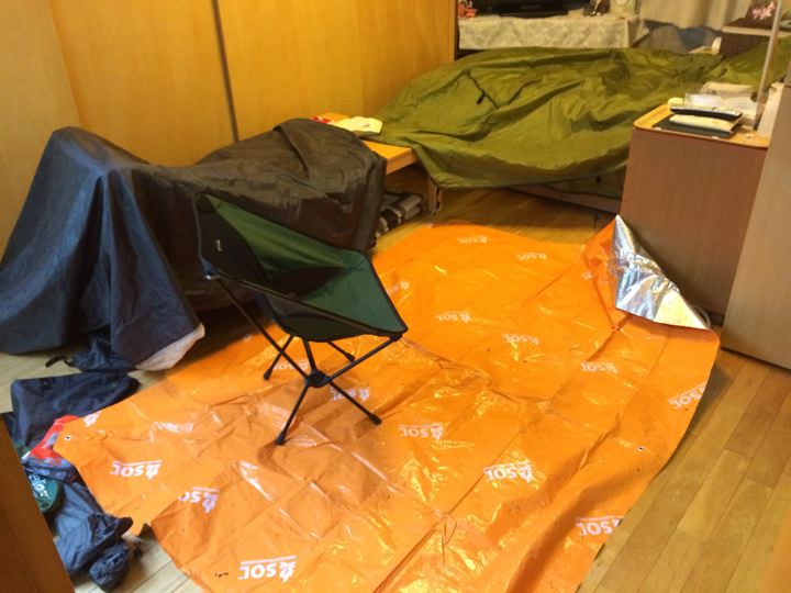 今回のキャンプは雨だったのでテントやグランドシートが干せていません。しかも、帰宅後もず〜っと雨なので屋外には干せません。なので仕方なく、おば〜が留守のうちに、おば〜のお部屋でテントを干そうと思ったのですが・・・