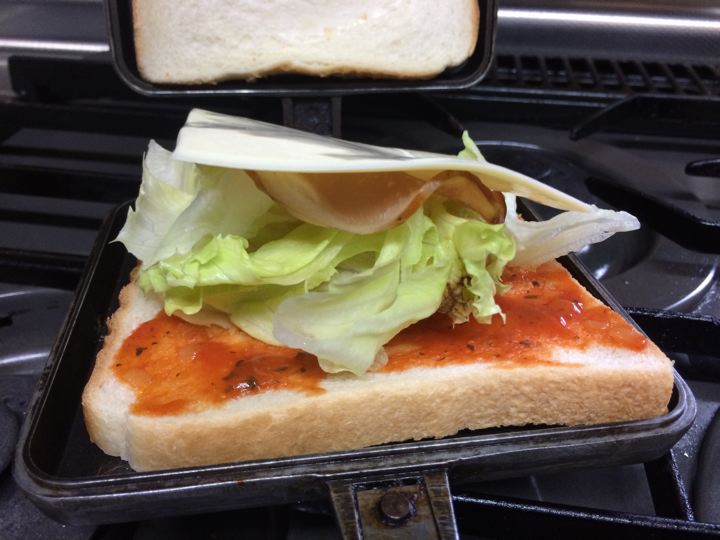 ピザペー、レタス、かぴかぴロースハム、スラチーで・・・。