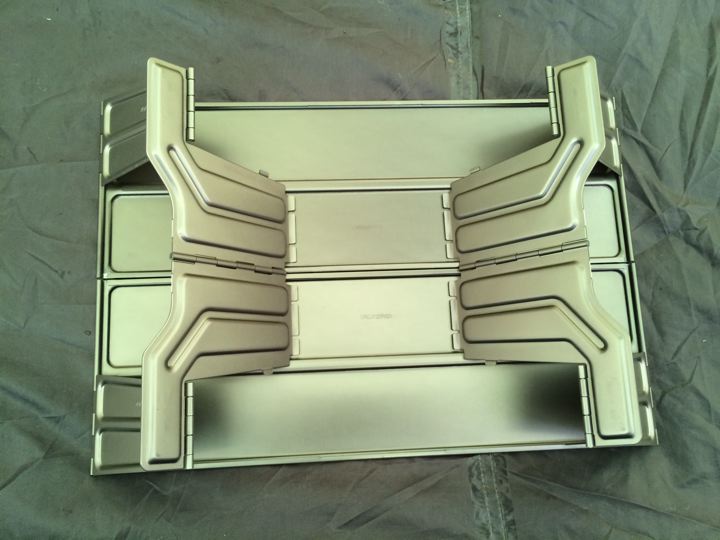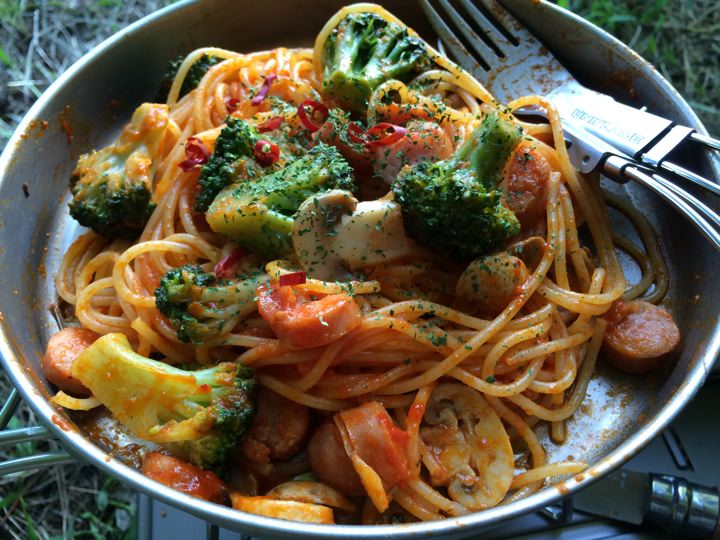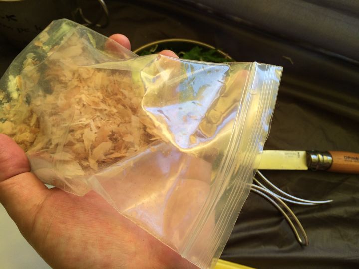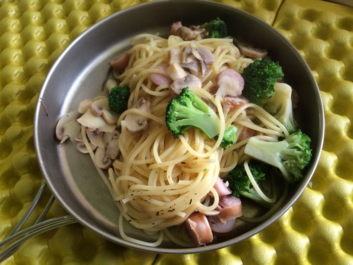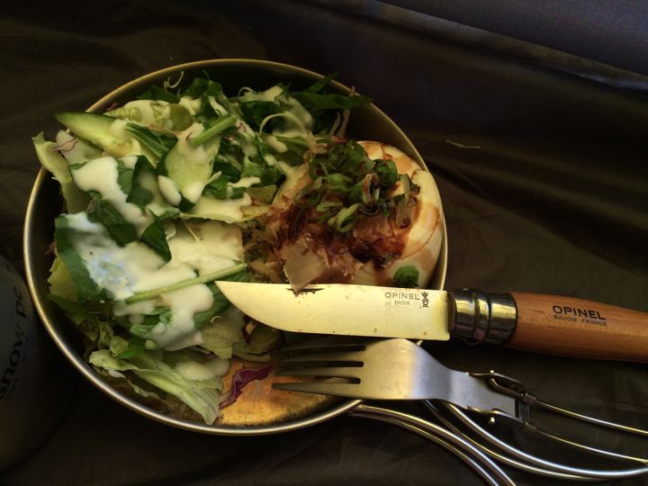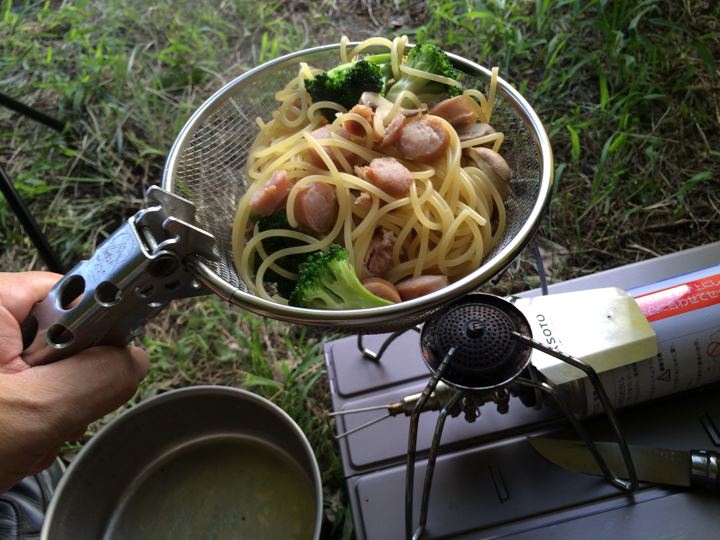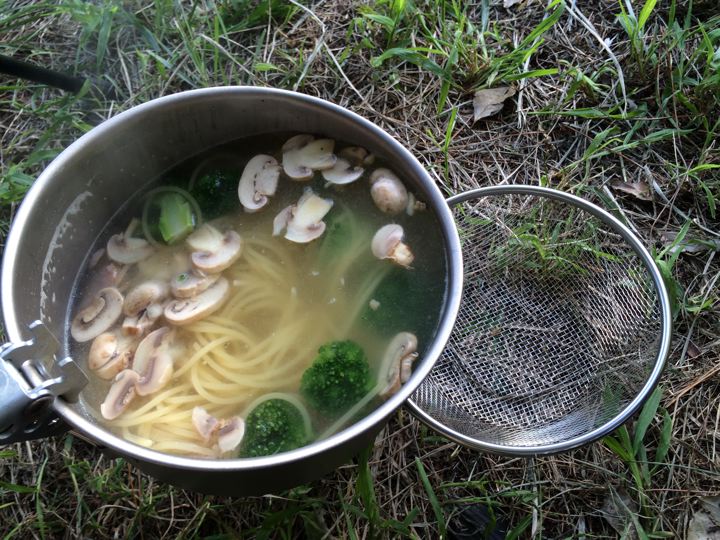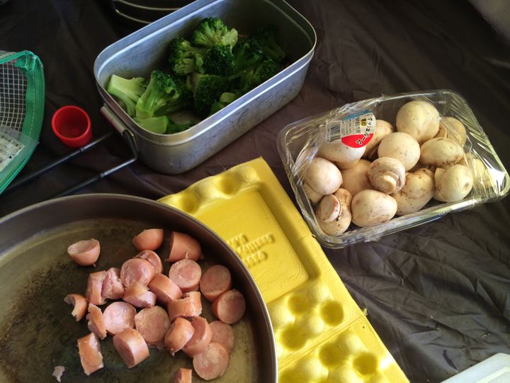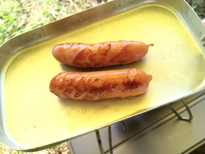 加熱したメスティン蓋のフライパンをグランドシートの上に置いたった!