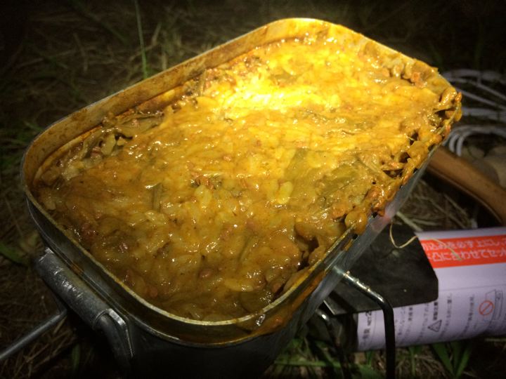 炊く前に激辛オクラカレーを半分乗せてみます。さて、どうなる事やら?