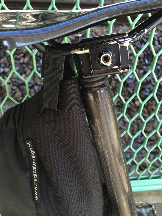 輪行バッグをくるくる巻いてサドルバッグへしまいます。