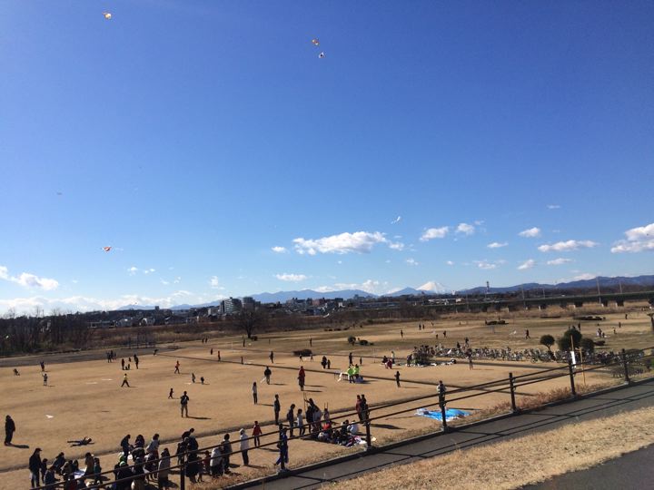 凧揚げしてる。遠くには富士山。