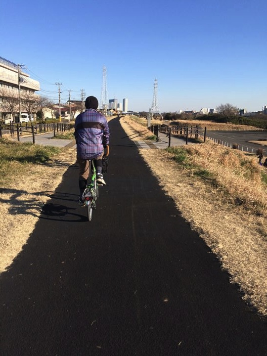 イノウエさんを追いかけて多摩川サイクリングロードを走ります。