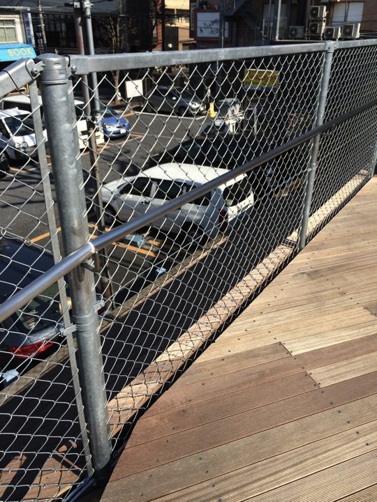 この大階段で2階から入るのか。溶融亜鉛メッキなネットフェンスもよろしい。