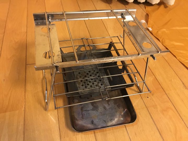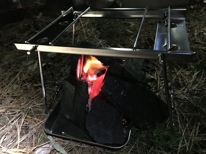 100金トレーに炭火置いて例の台をセット!ファイヤー!