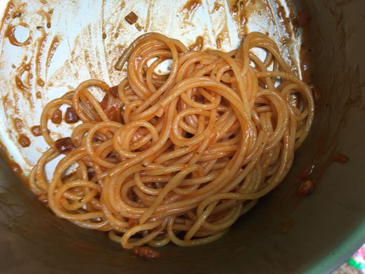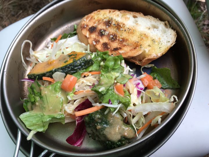 朝ご飯は、サラダとパスタとリョウさんからもらったバゲットをトーストしたやつ。
