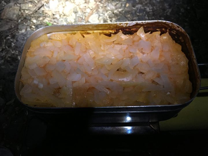 で、モーニングの準備へ。メスティンで作る「いきなりチャーハン」です。