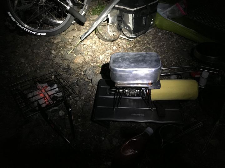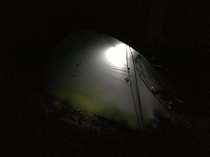 照明はブロちゃんで日常的に使ってるキャットアイのVolt300にモンベルのくしゃくしゃ紙の行灯をつけたやつ。結構明るく、光が広がるので優れものです。