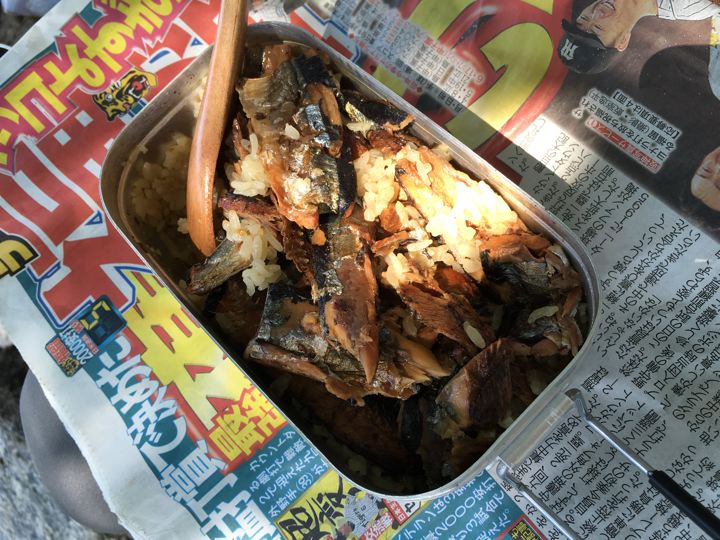 さんまの炊き込みご飯?渋いけどうみゃそ〜!敷物がいいですね。