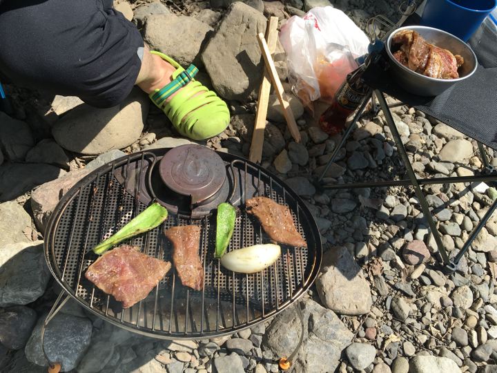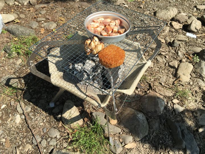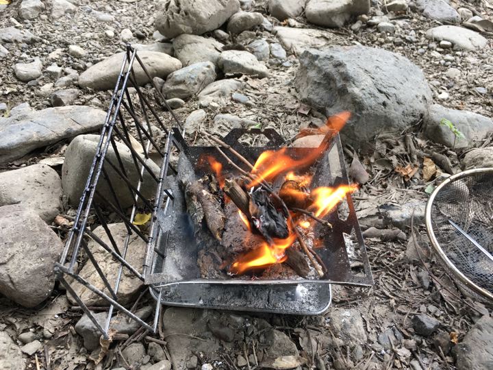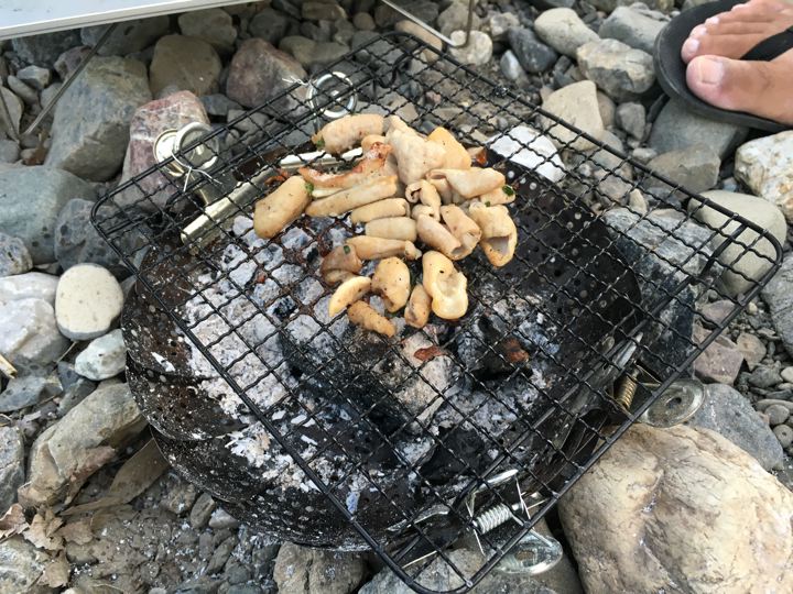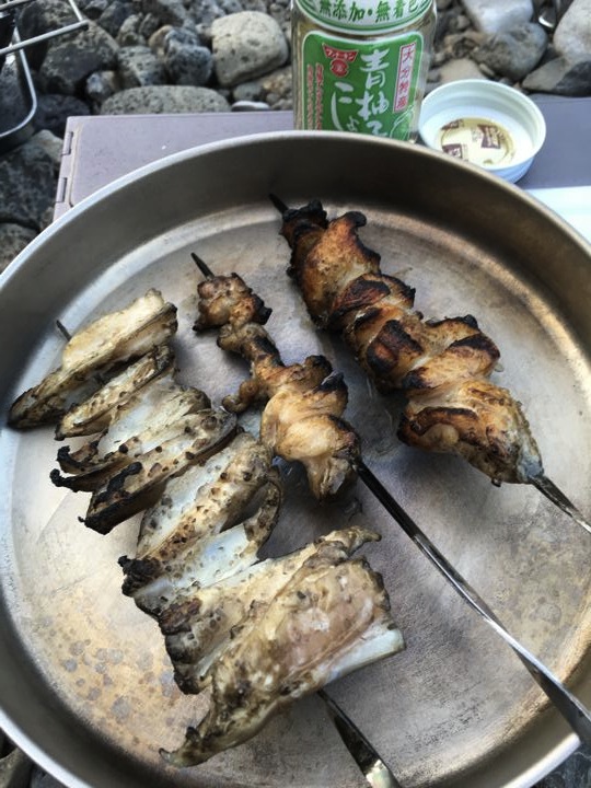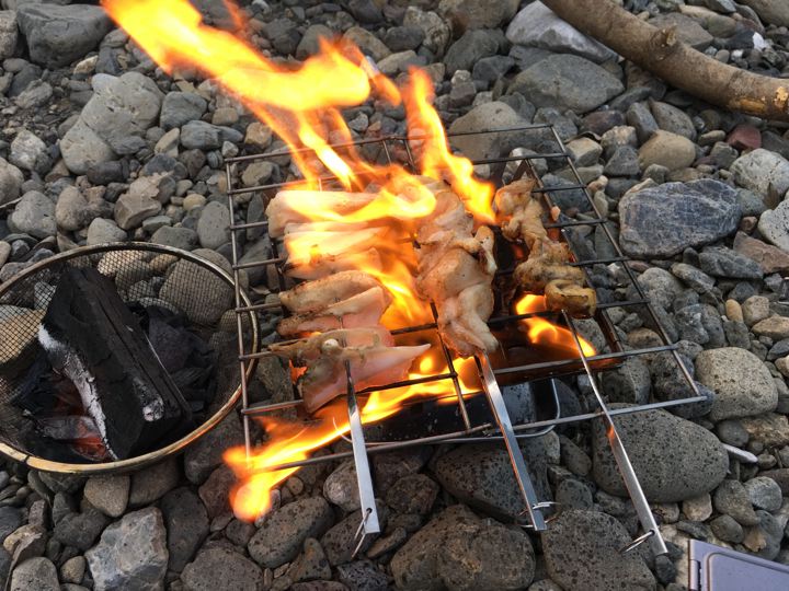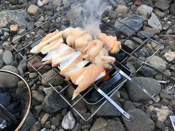 リョウさんは自作の焚火台でもつ焼き?これカッコいいです。