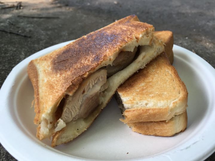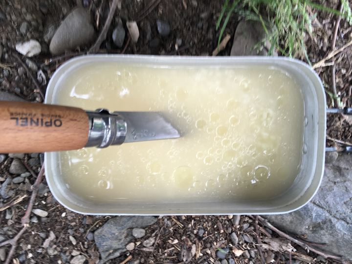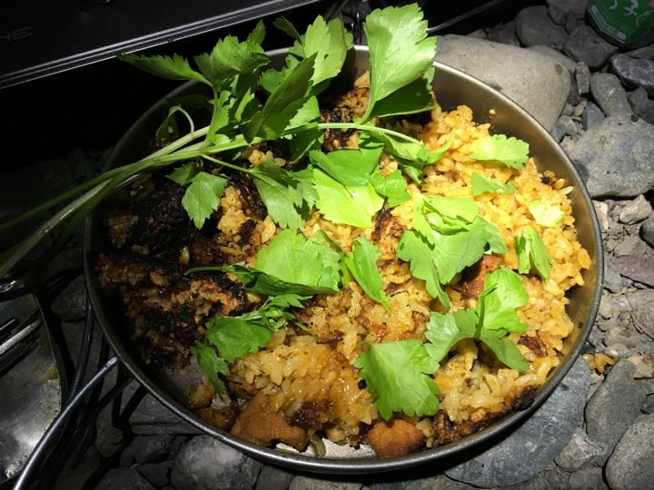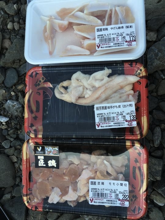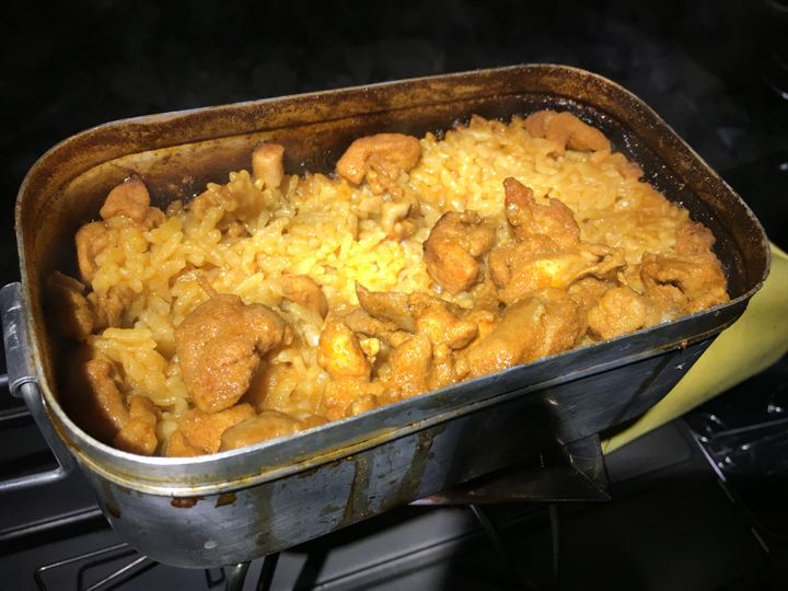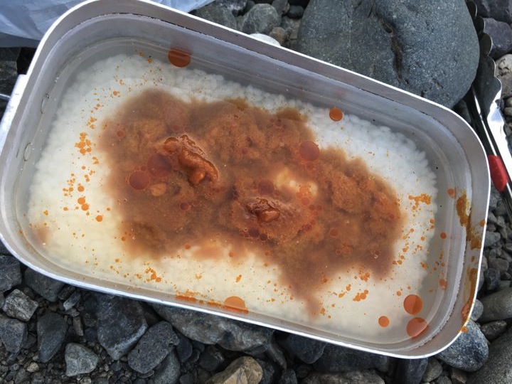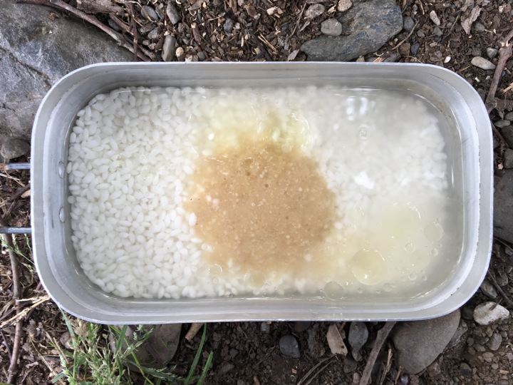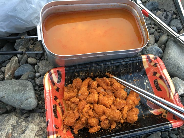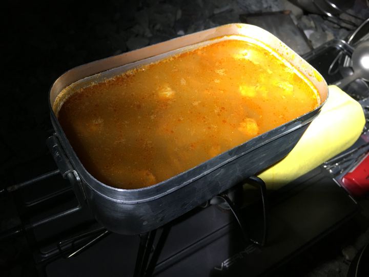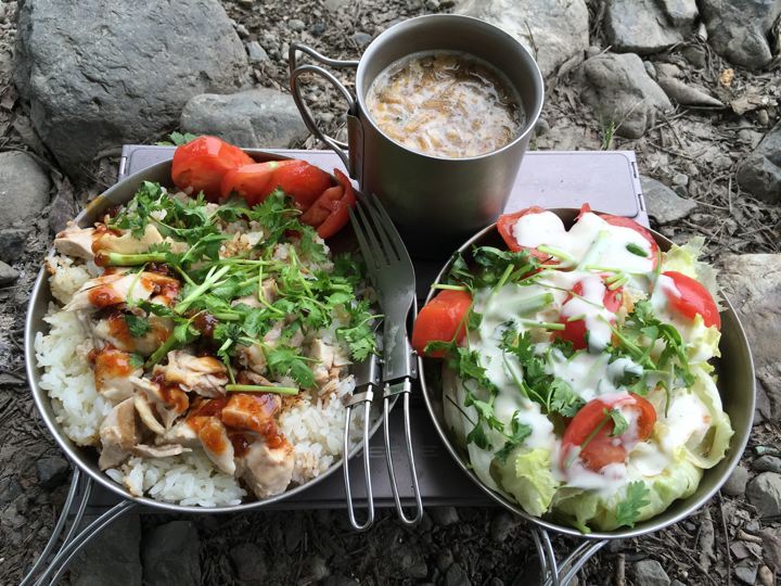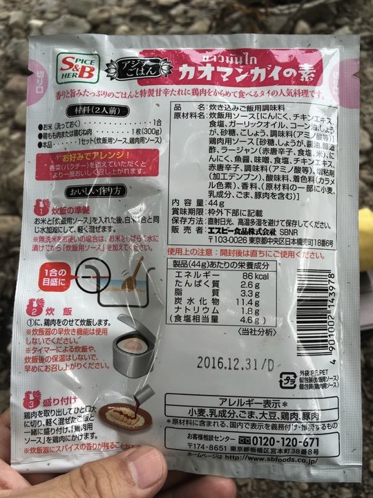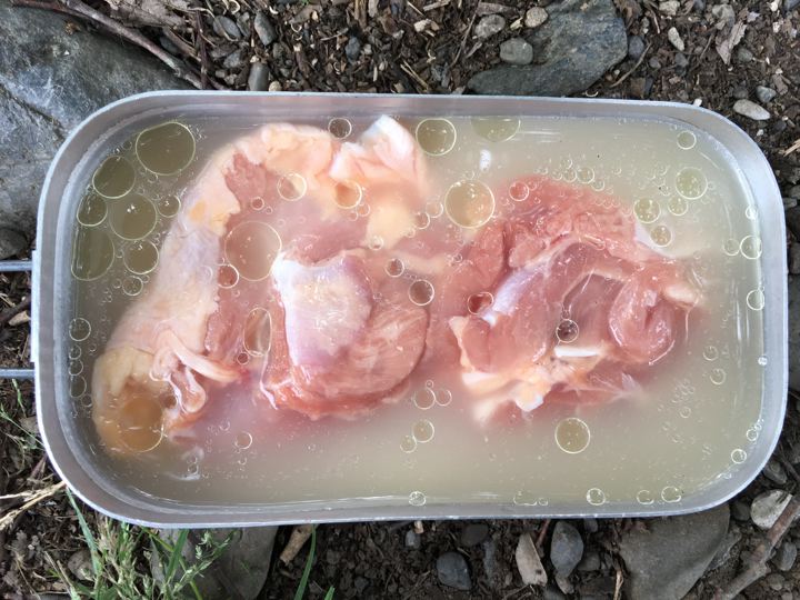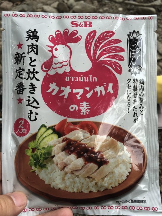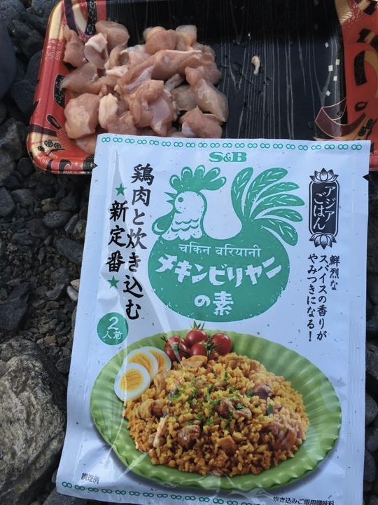 皆さんがガサガサと撤収中にやっと朝ご飯の支度です。カオマンガイの素。既製品でやるのは初めて。