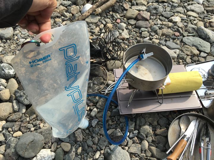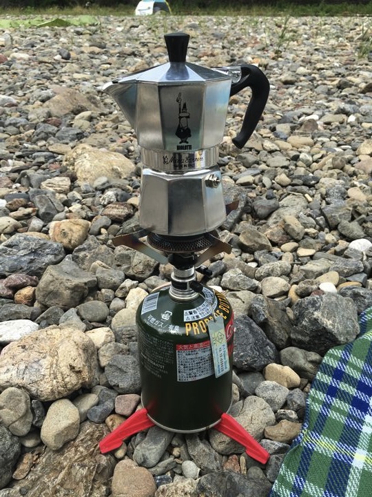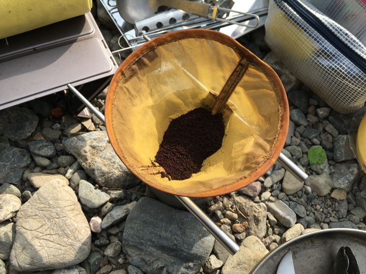 めちゃ二日酔いなので、川の水をプラティパスにくんでモーニング珈琲で気合いを入れます。