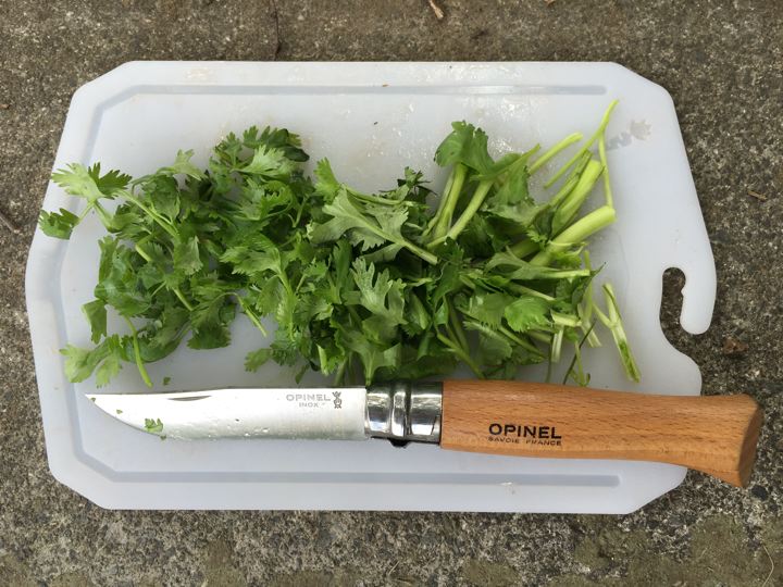 パクチーをウルトラライトぺらぺらまな板にてオピネルで、カット!