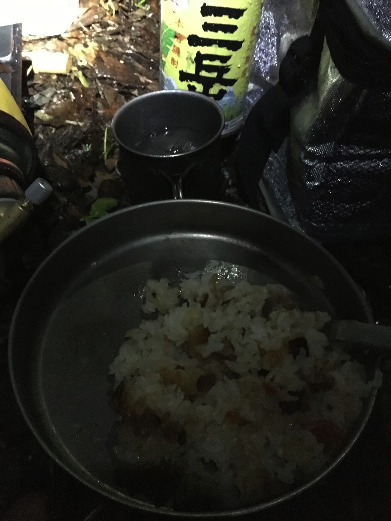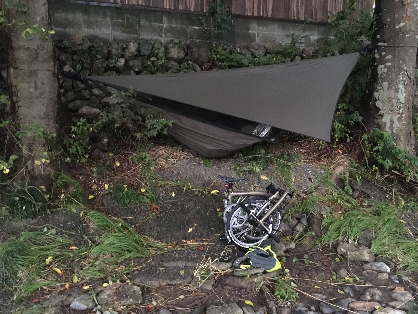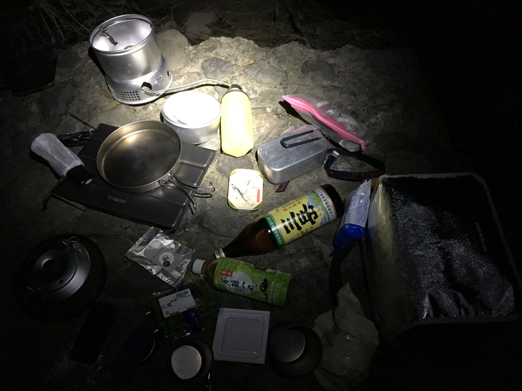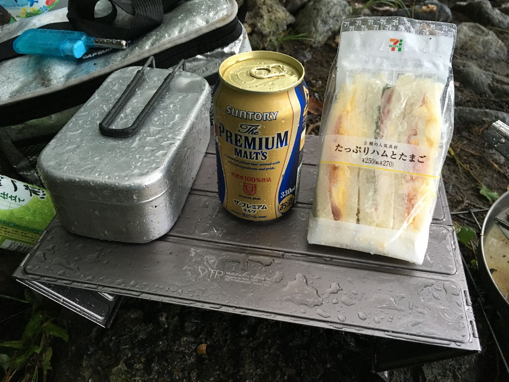 今回はウルトラライトって事で、寝袋はSOLの一番軽いビビィにしました。透湿性がないので蒸れと結露でちょっとびちょびちょ。泣