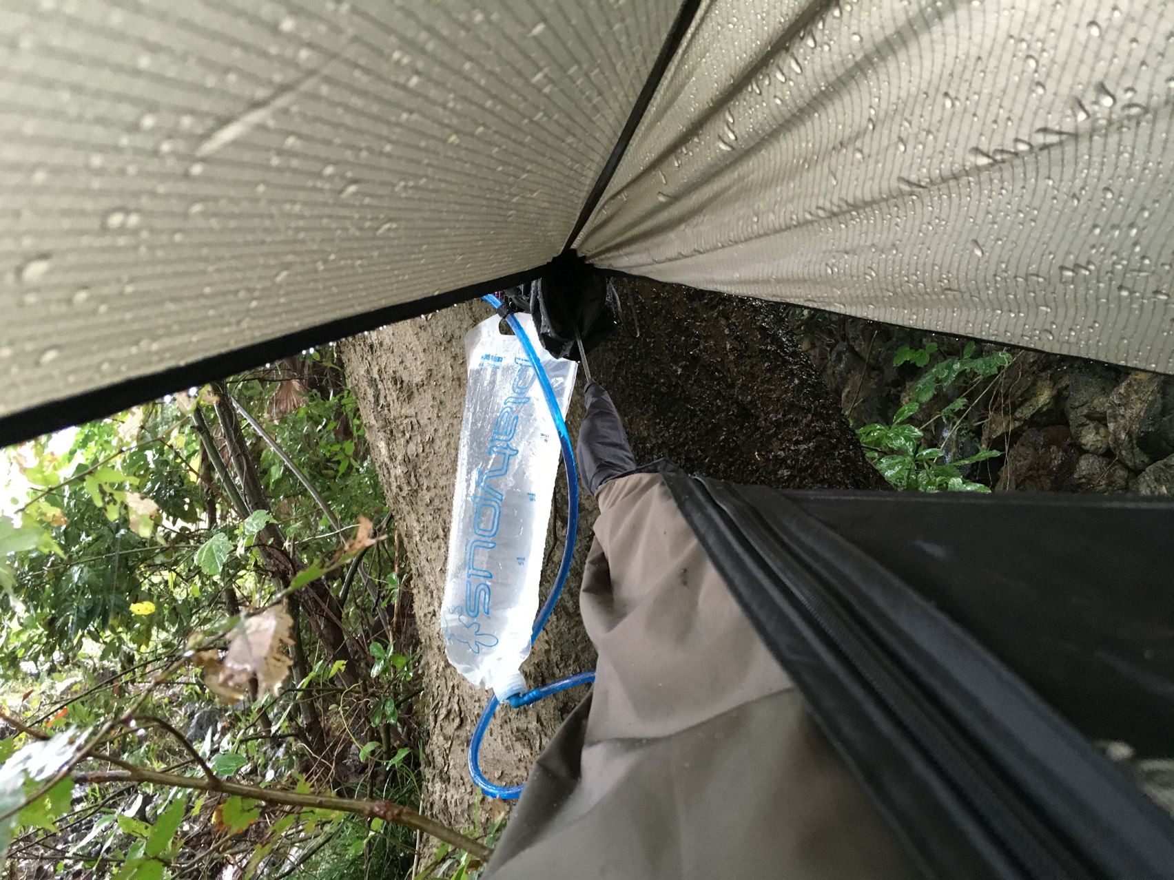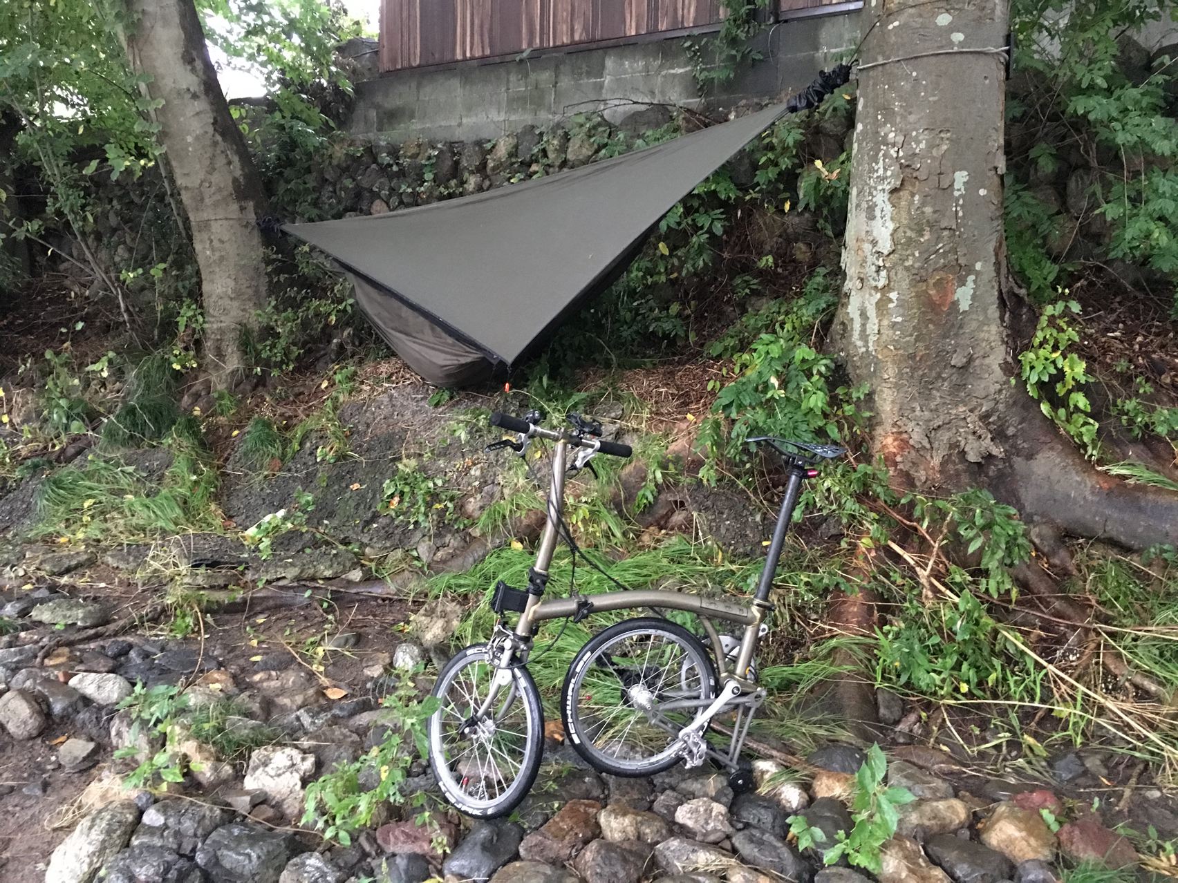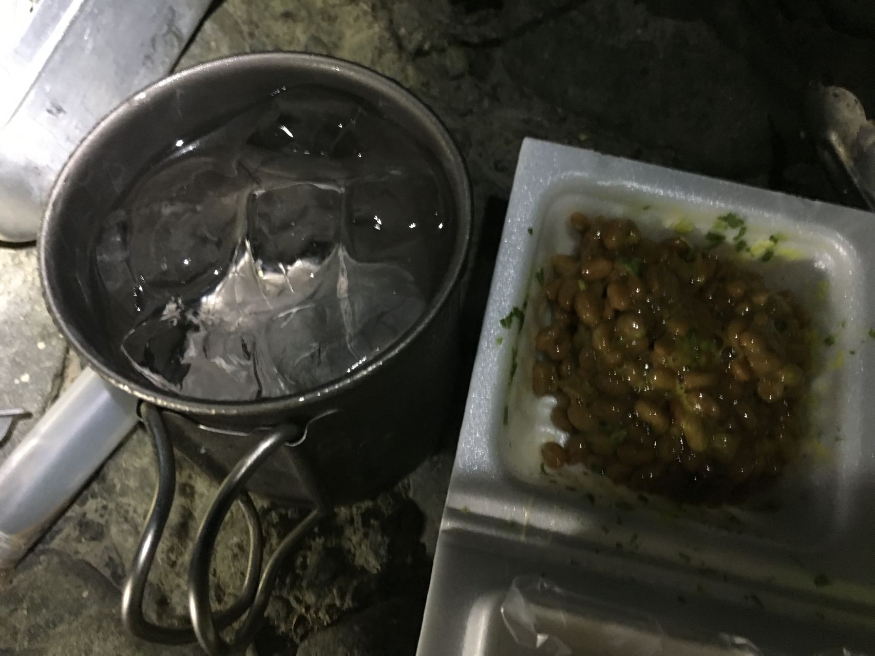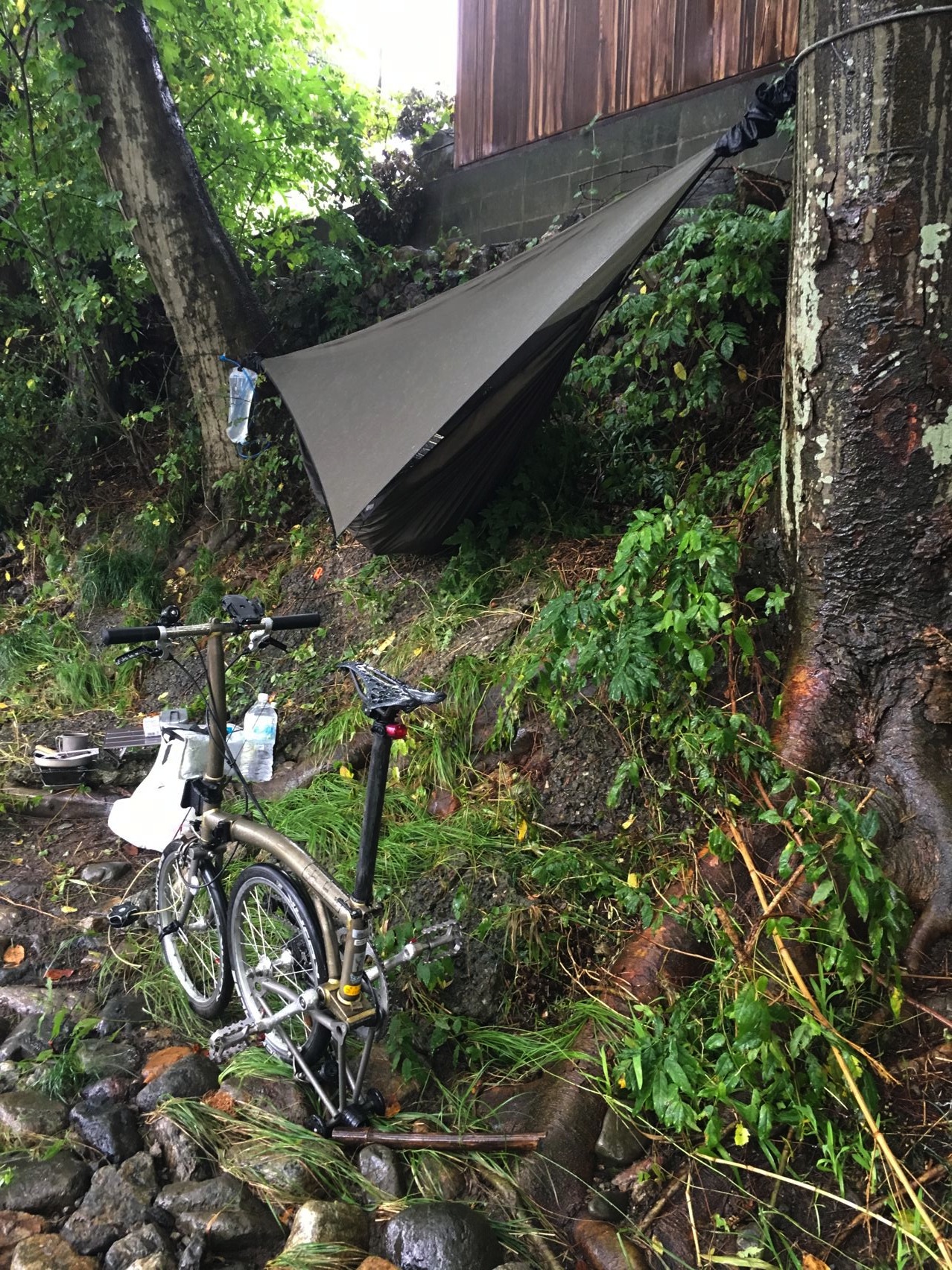 今回はウルトラライトって事で、寝袋はSOLの一番軽いビビィにしました。透湿性がないので蒸れと結露でちょっとびちょびちょ。泣