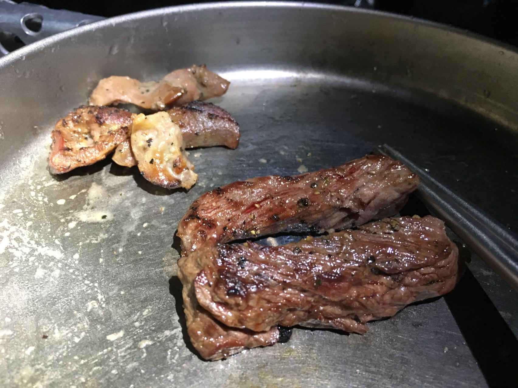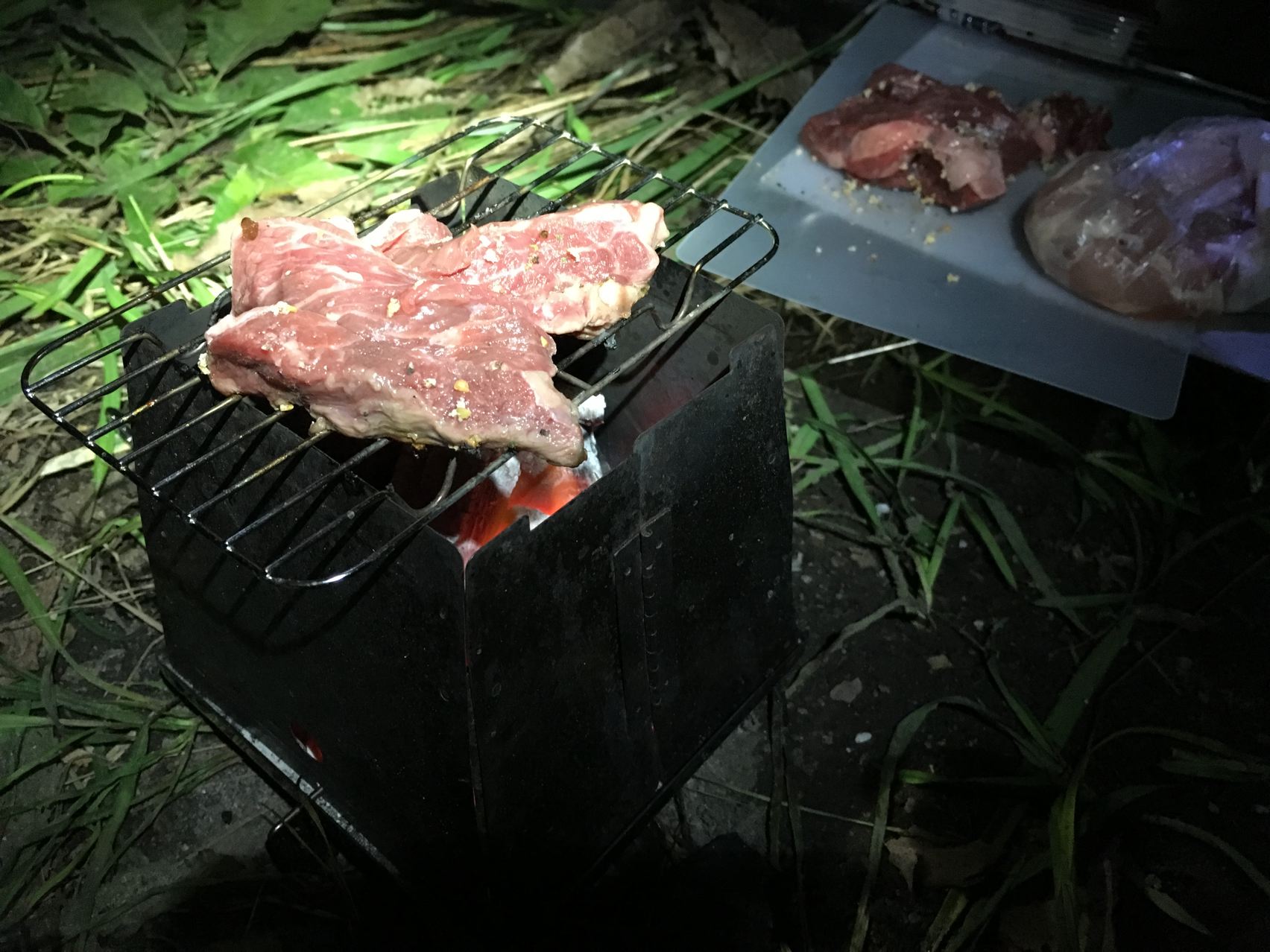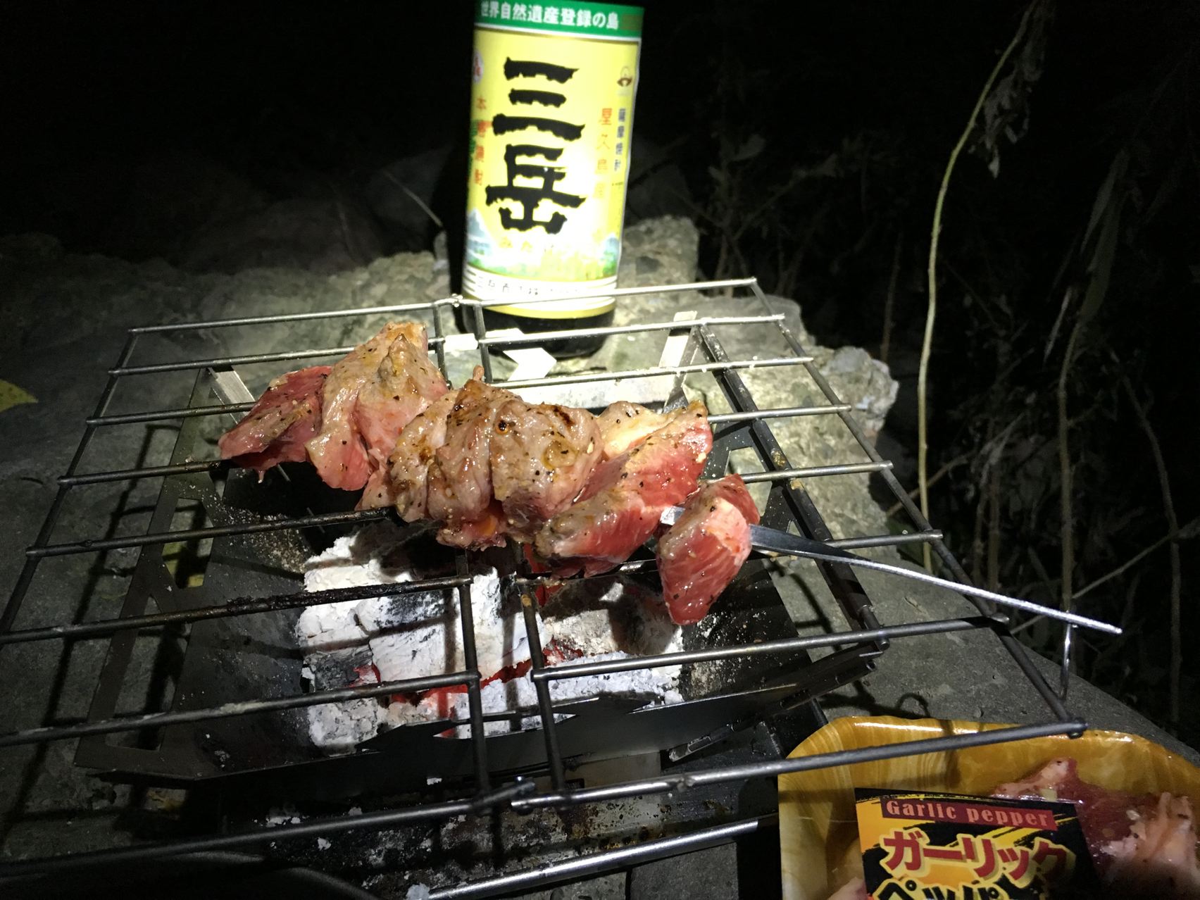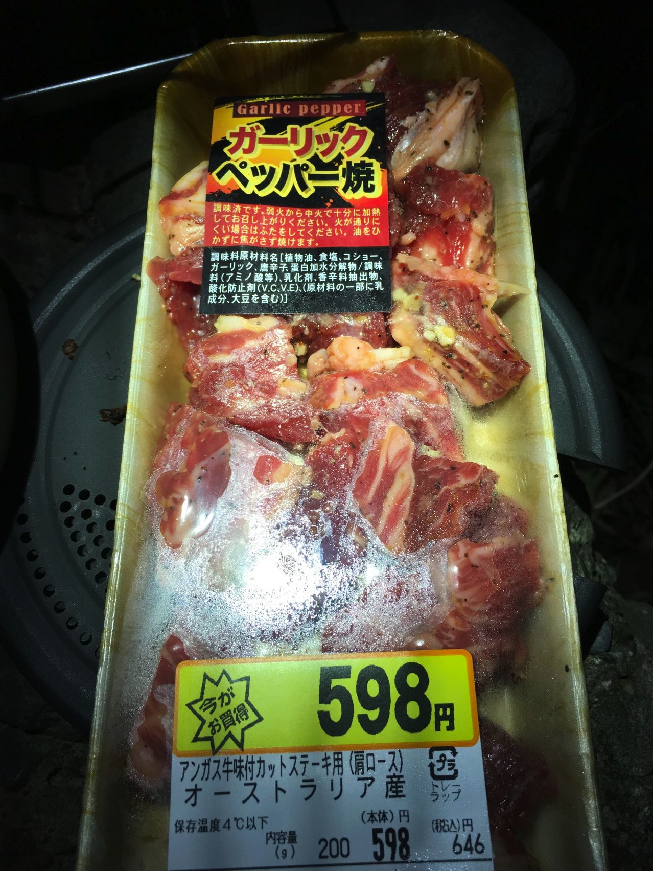 今回初めて味付肉を試します。ガーリックペッパー味のついたオーストラリア産アンガス牛肩ロースカットステーキを串焼きにて。