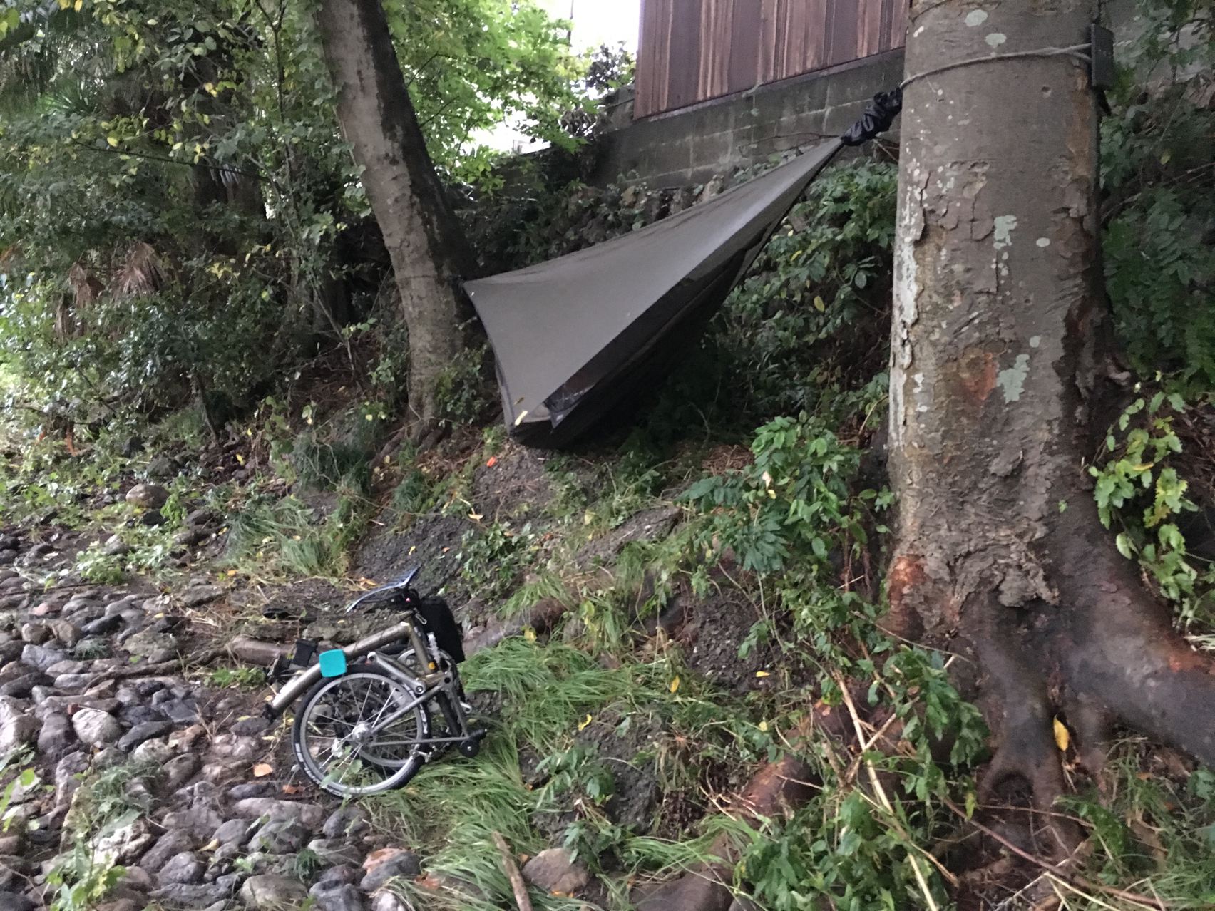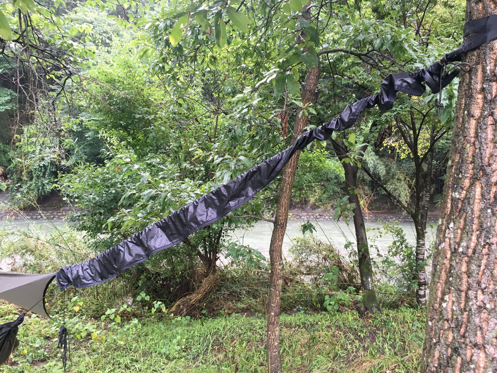 崖の木へのへねり具合はこんな感じです。兎に角木が2本あればどこでも張れます。