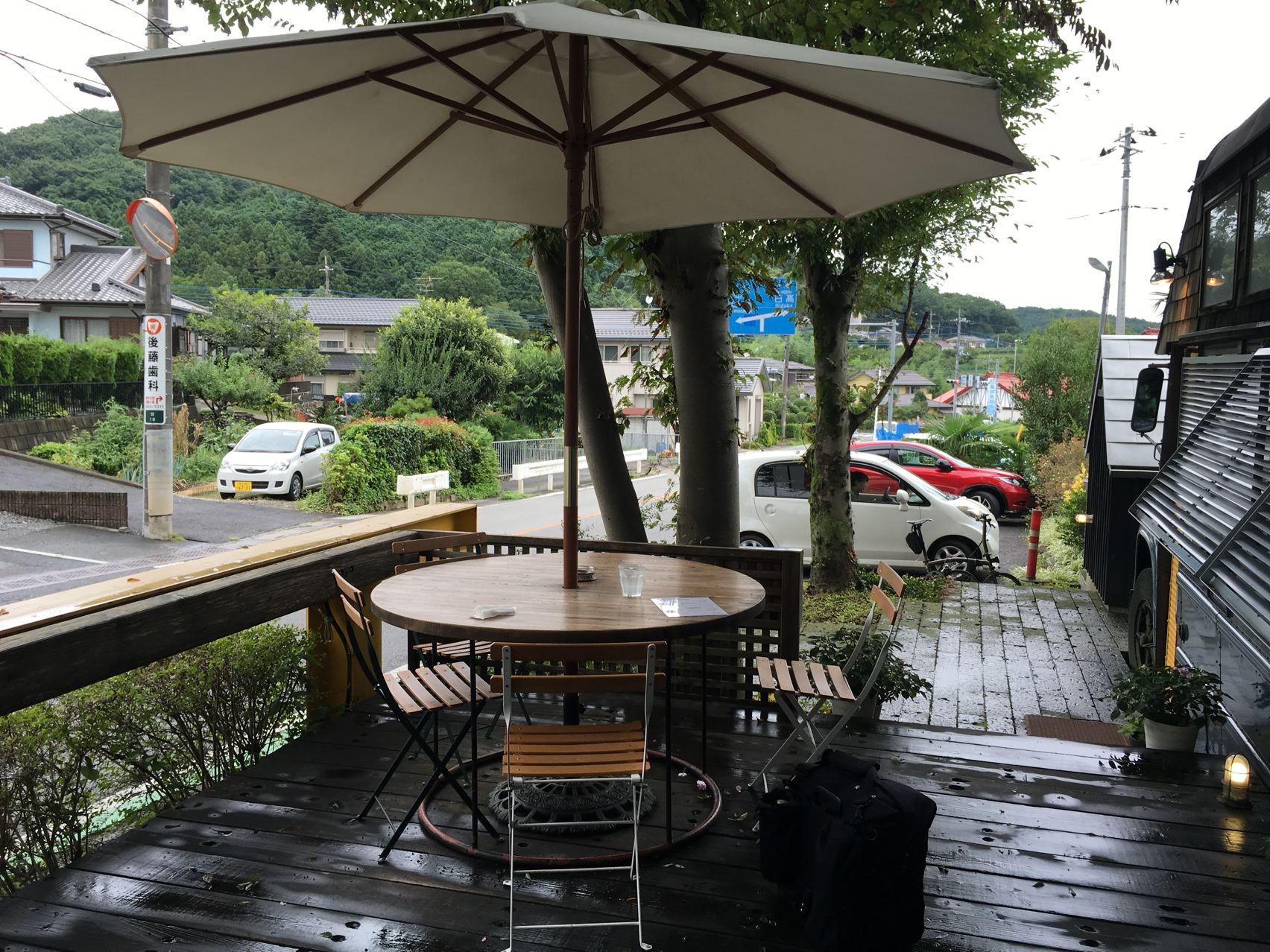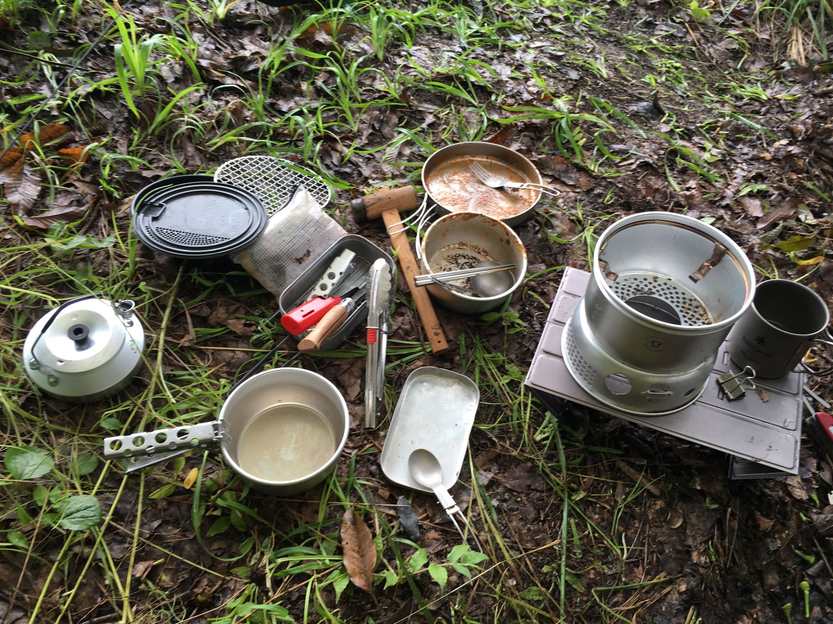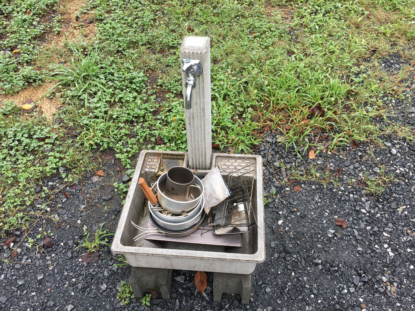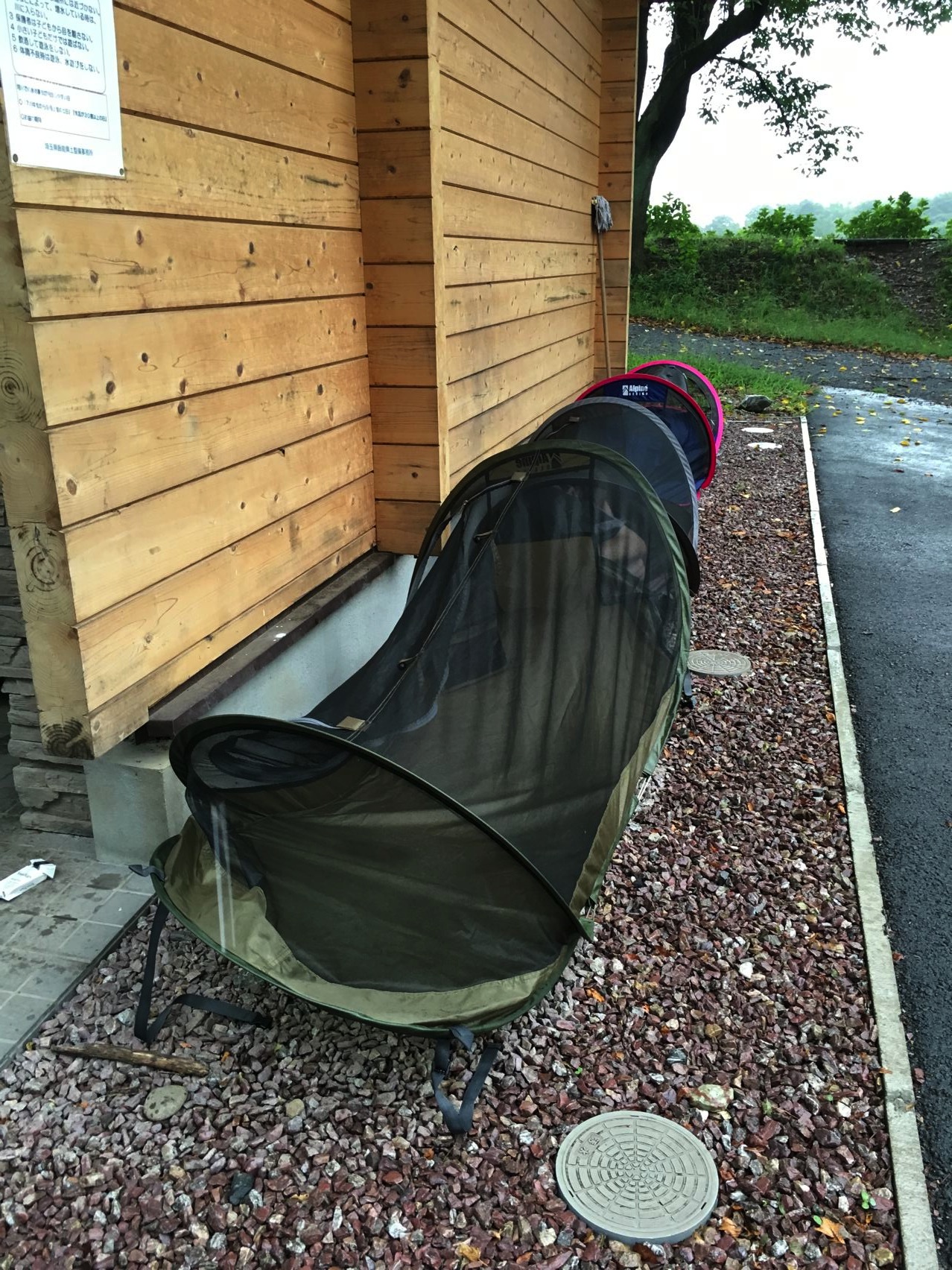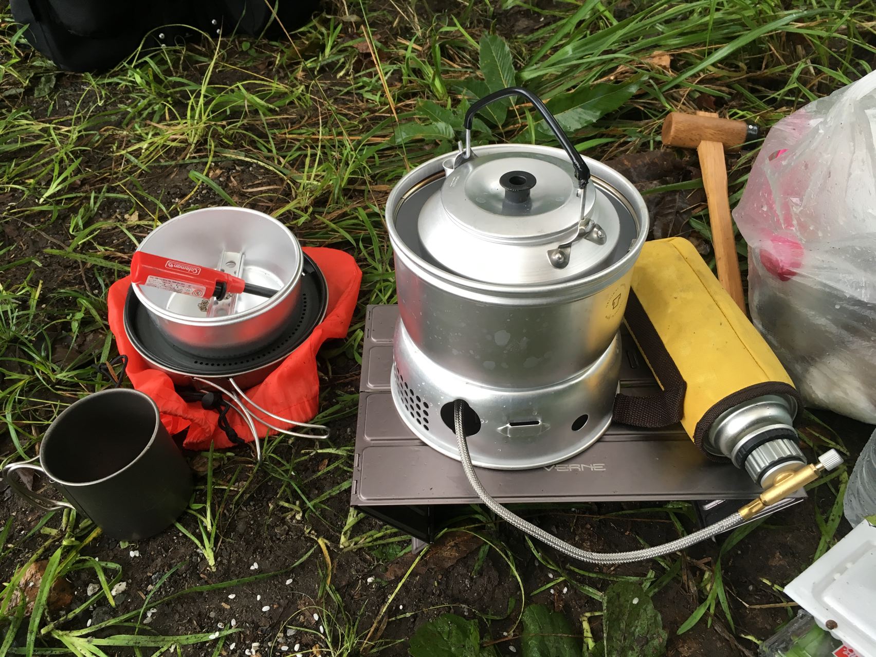 離れたダイニングキッチンも雨ざらし。やっぱり雨キャンプにはタープが必要かなぁ。