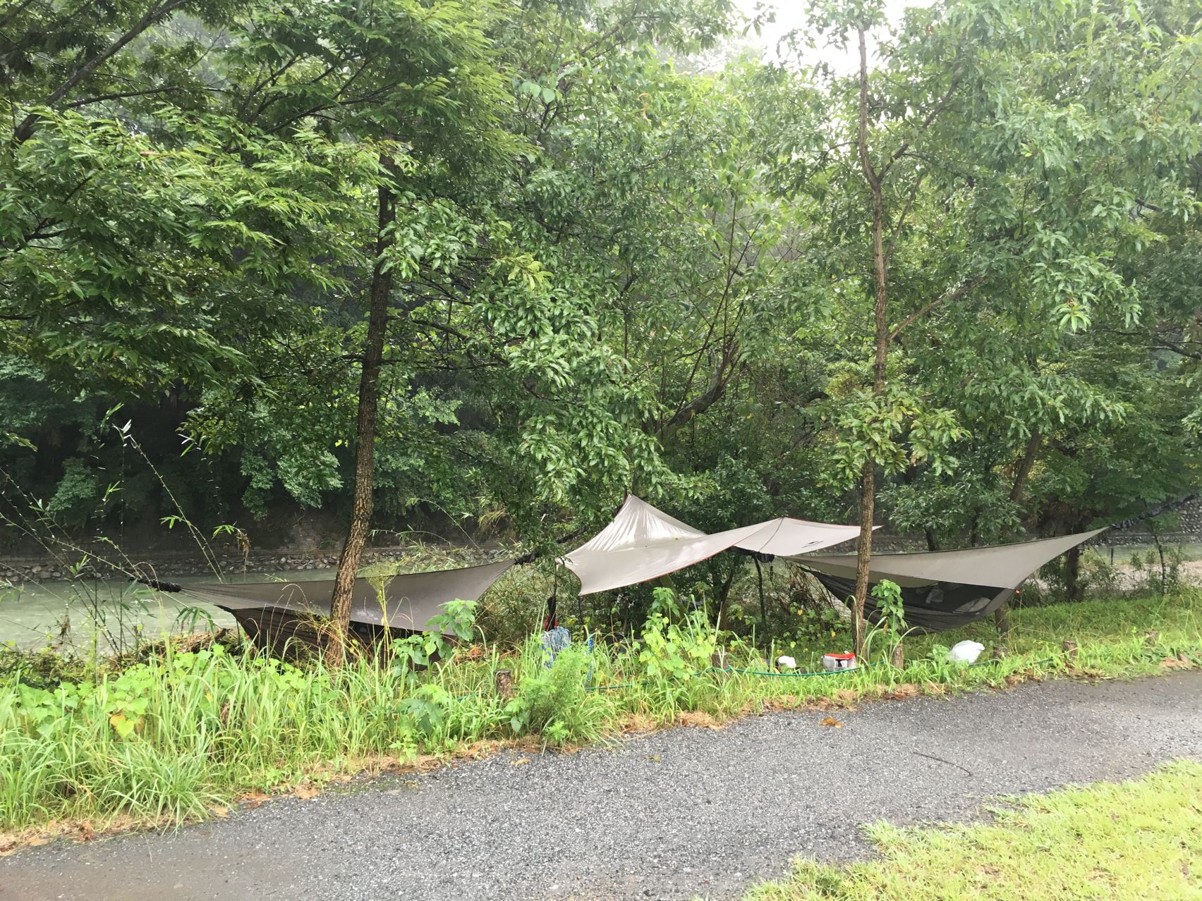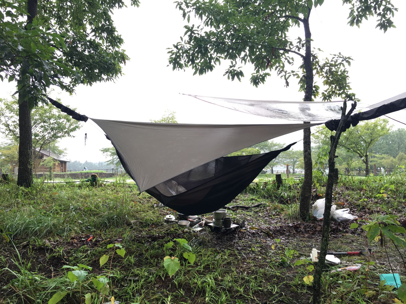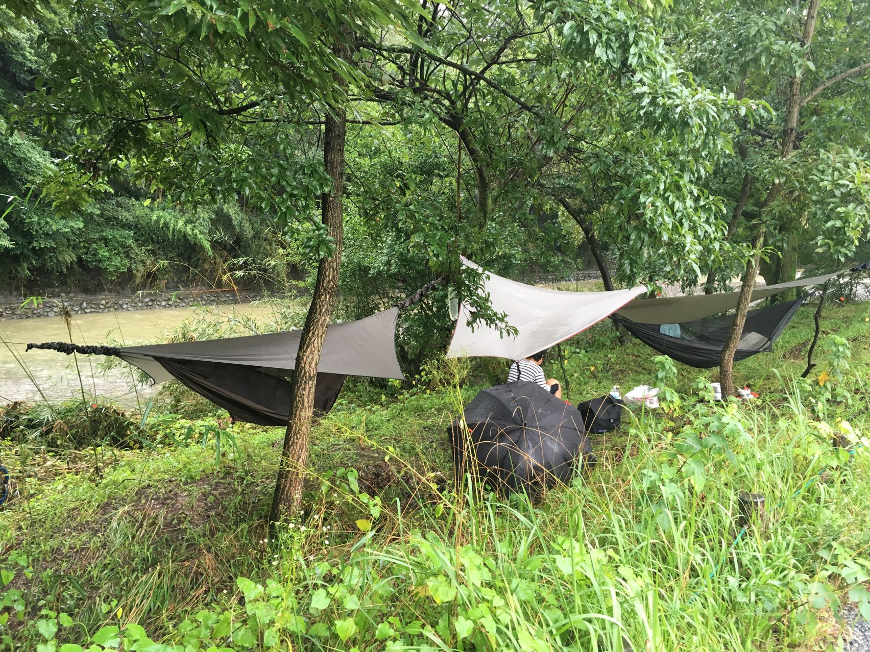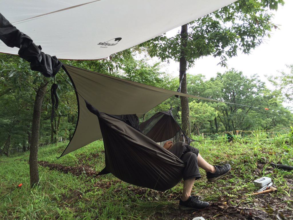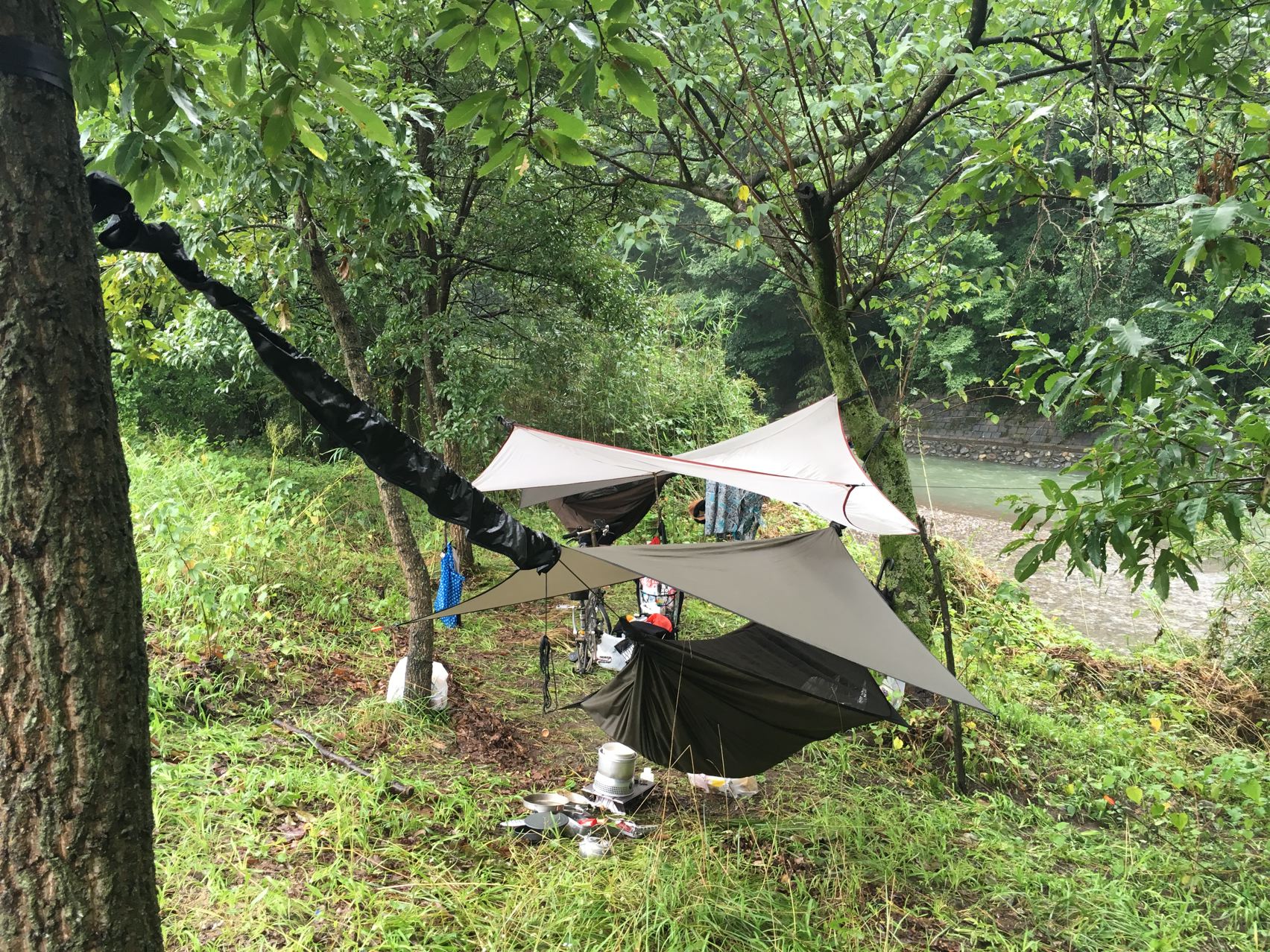 リョウさんがタープを持ってきてくれたので助かりました。やっぱ雨の日はタープ必須!