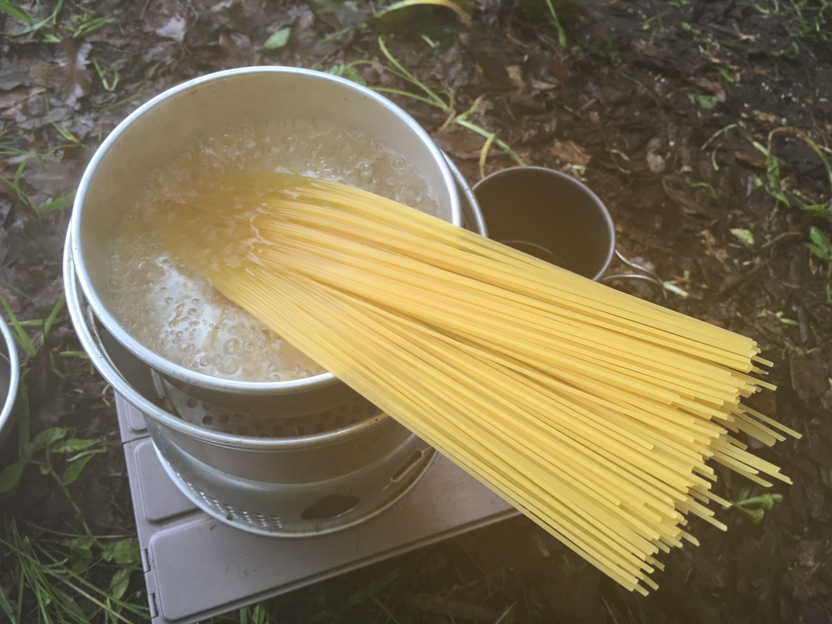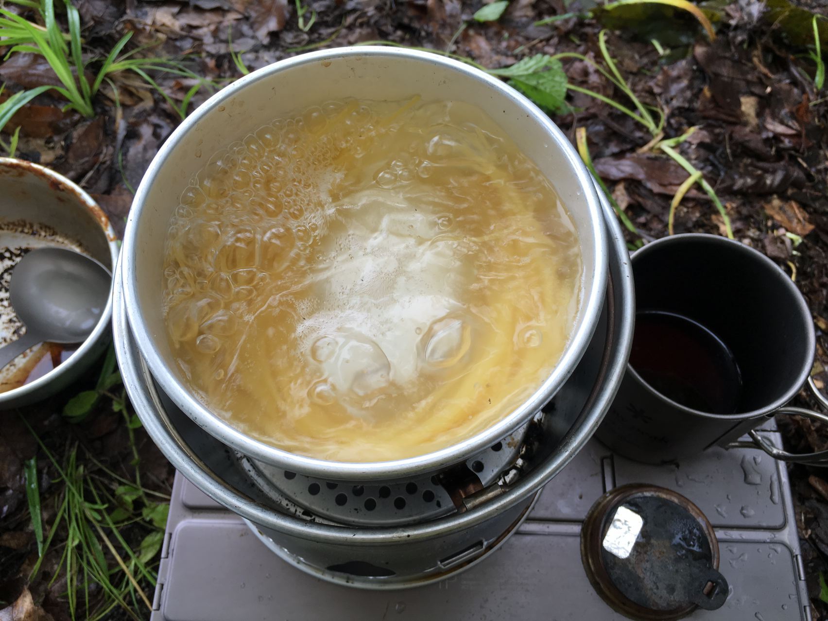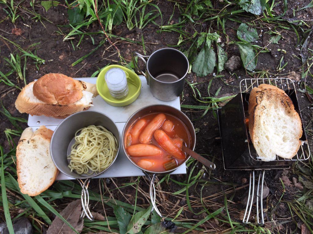 朝ご飯を作ります。ガスが切れたのでリョウさんからアルコールをもらってアルコールストーブ借りてパスタ。
