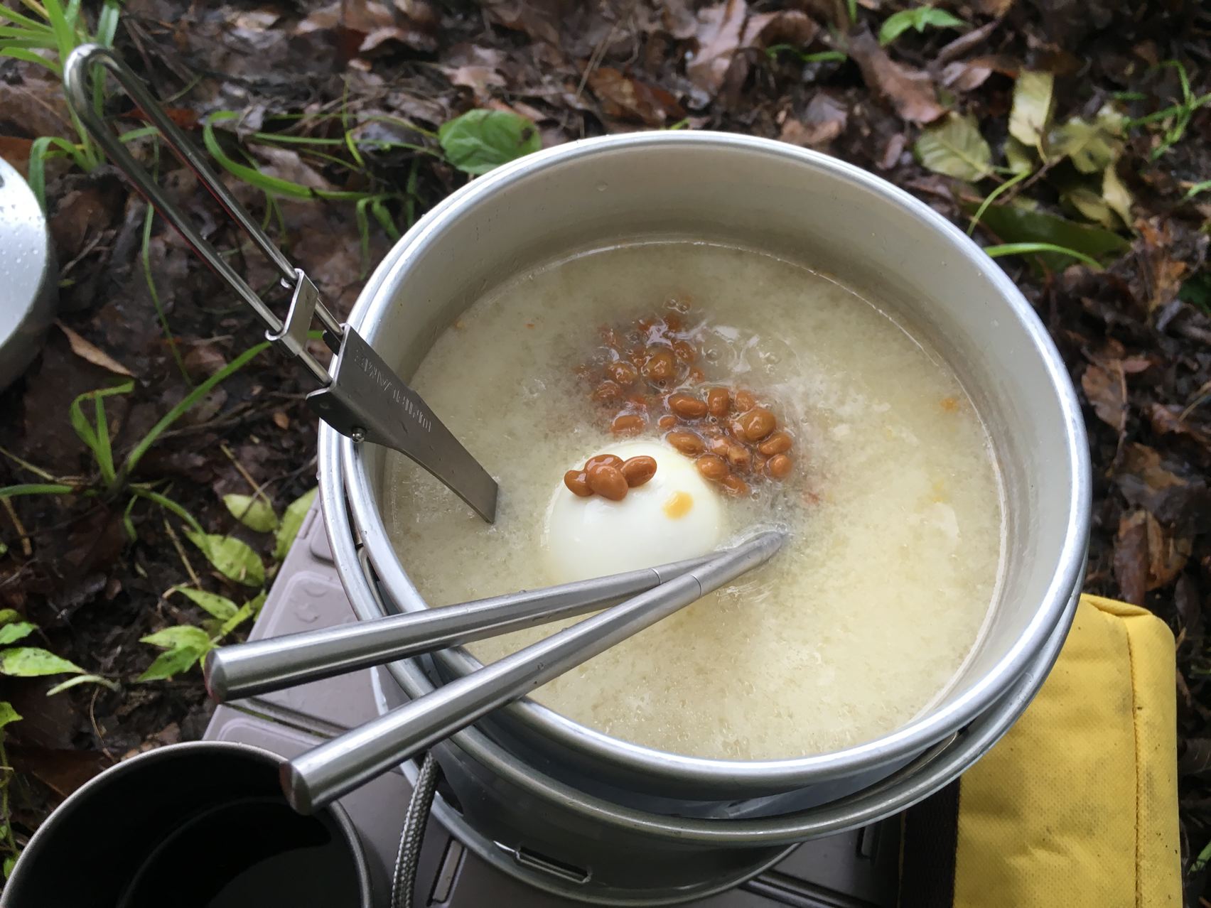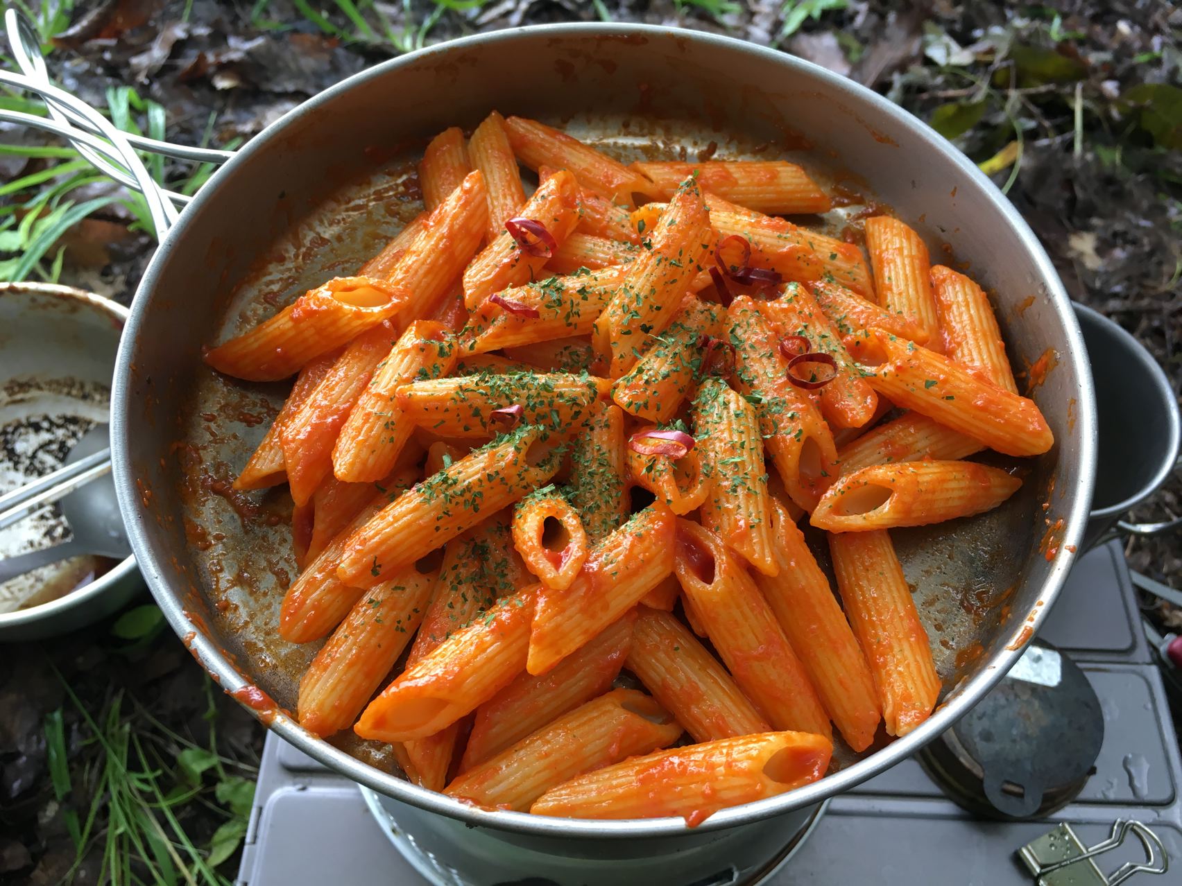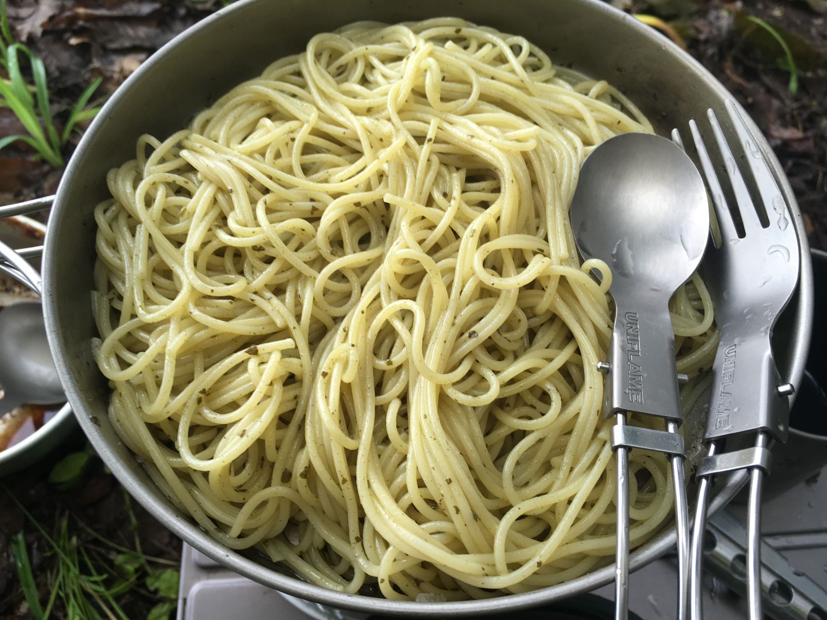 朝ご飯を作ります。ガスが切れたのでリョウさんからアルコールをもらってアルコールストーブ借りてパスタ。