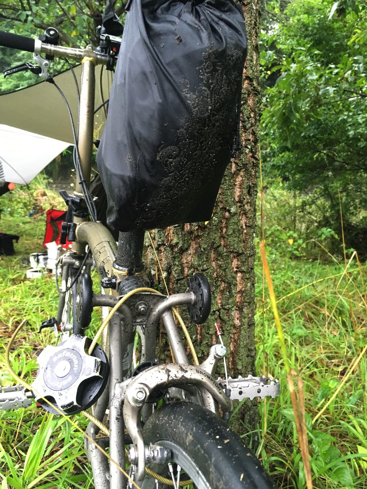 そしたらなんとぉーっ!ブロくんは泥よけがついてないのでサドル下の輪行バッグがドロドロに。ぬ~