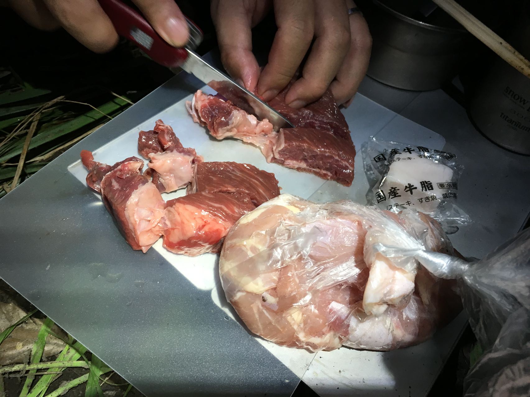 一生懸命お肉カット。