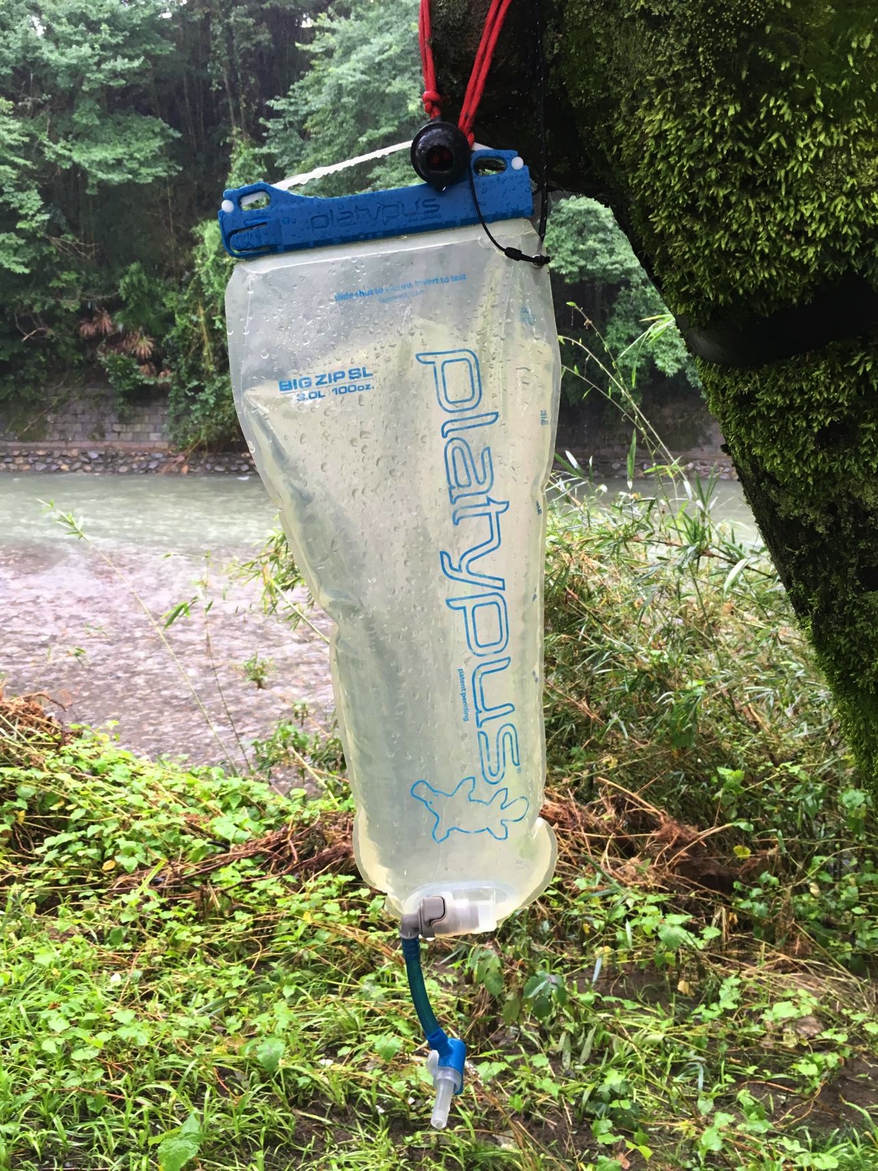 左右のロープをつたってついにお水がハンモック内部へ〜!つめた〜