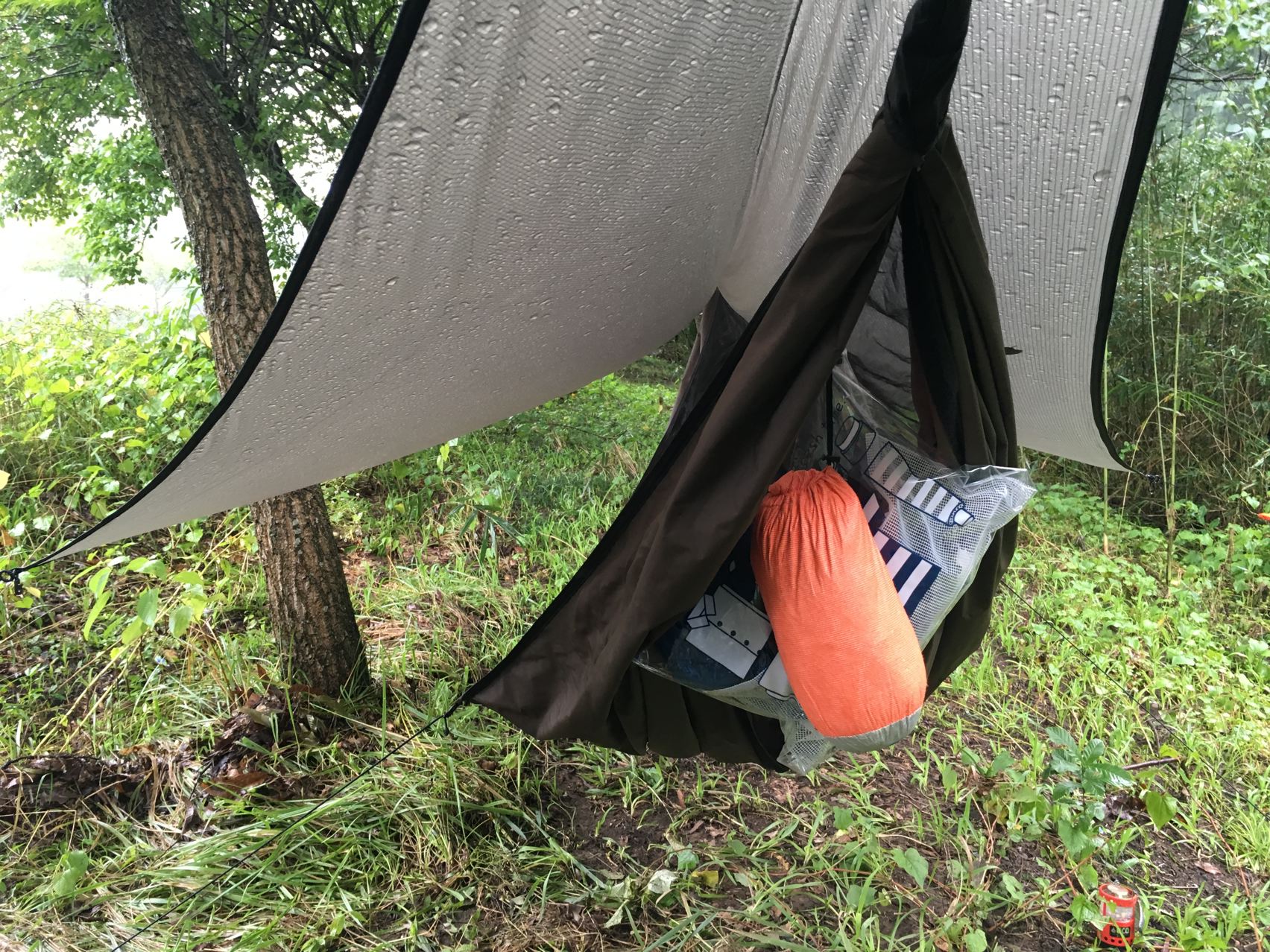 さささとスネークスキンを引っぱって、レインフライとバグネットとハンモックを一気に収納してしまいます。やっぱり撤収早いわ〜。