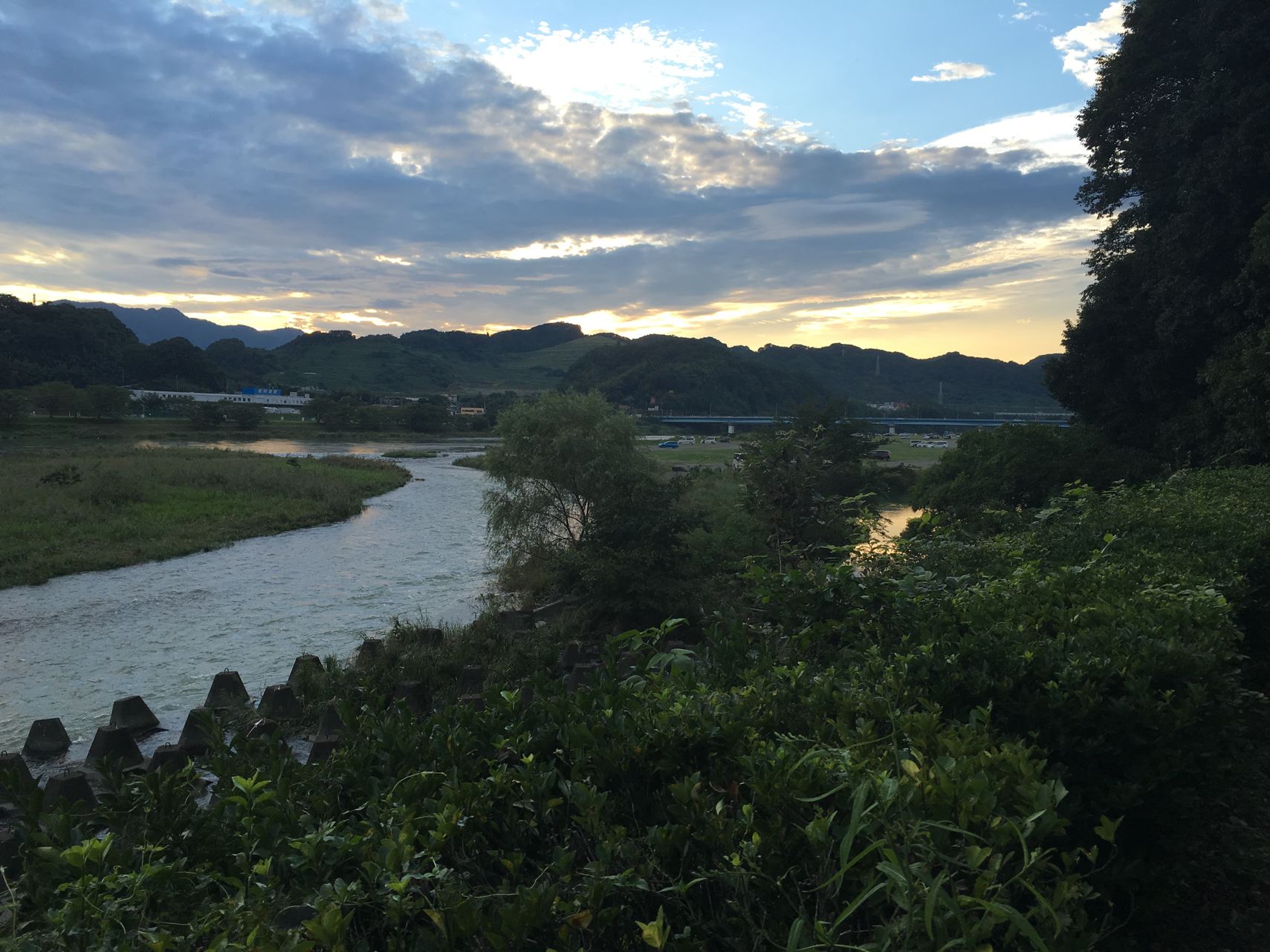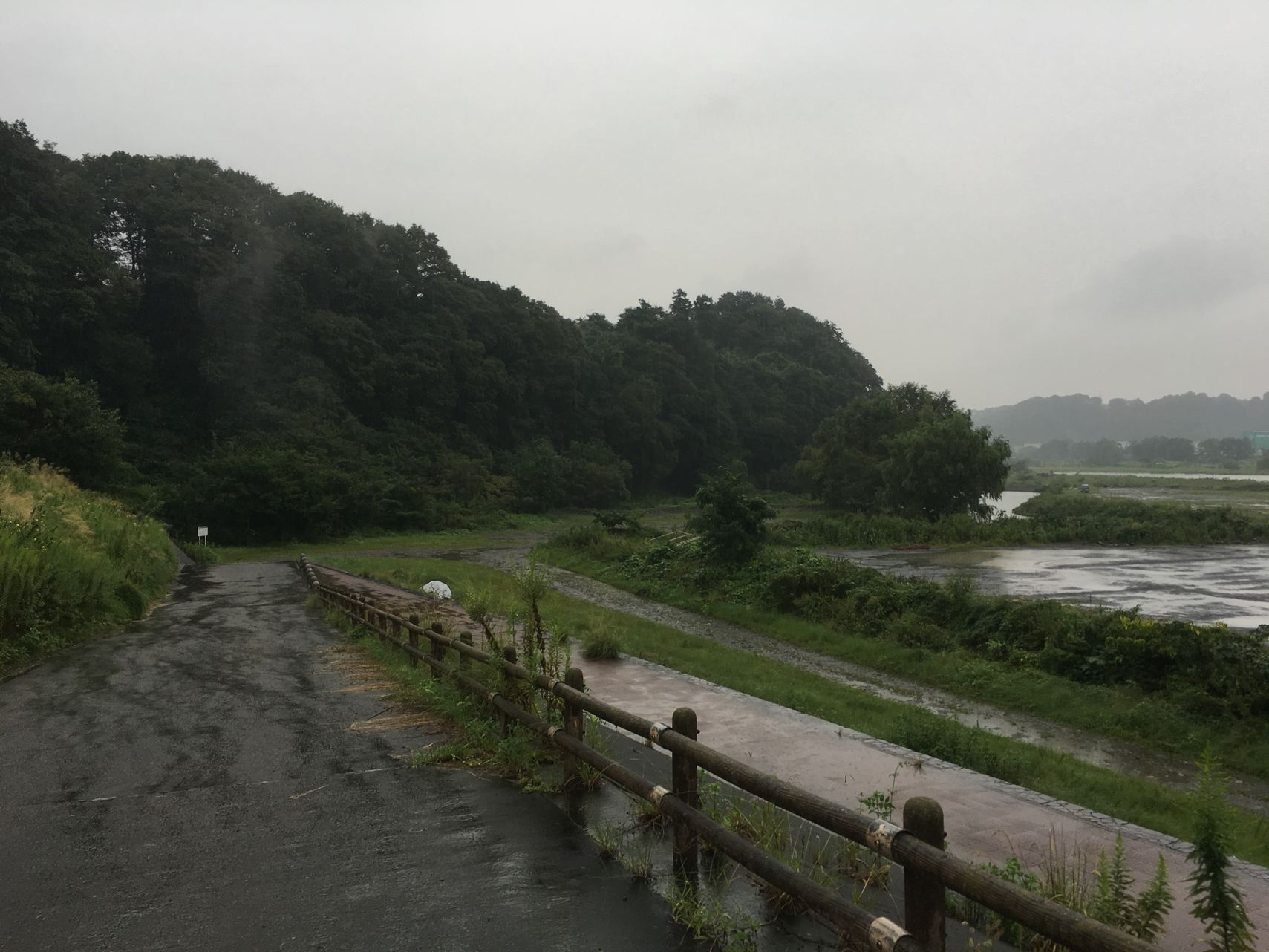 豪雨の中なんとか相模川まで下りました。あの森の向こうがキャンプ場です。