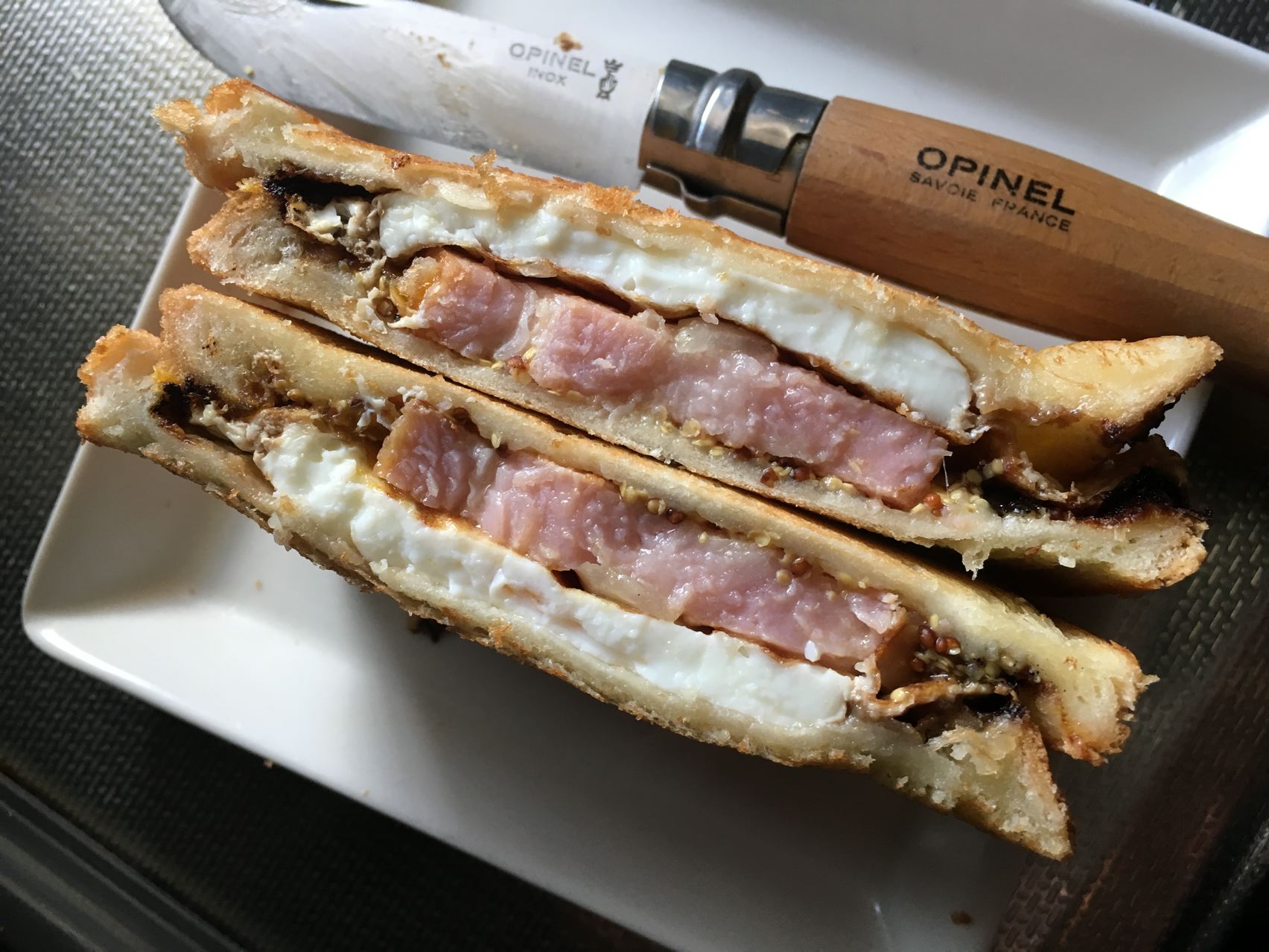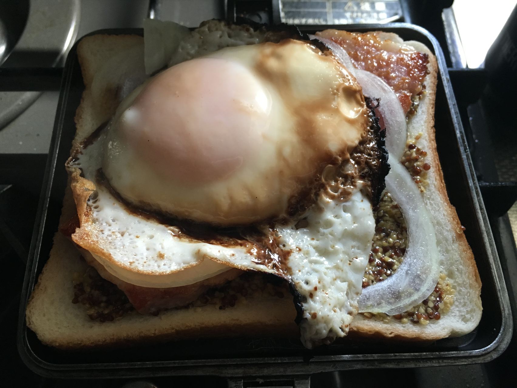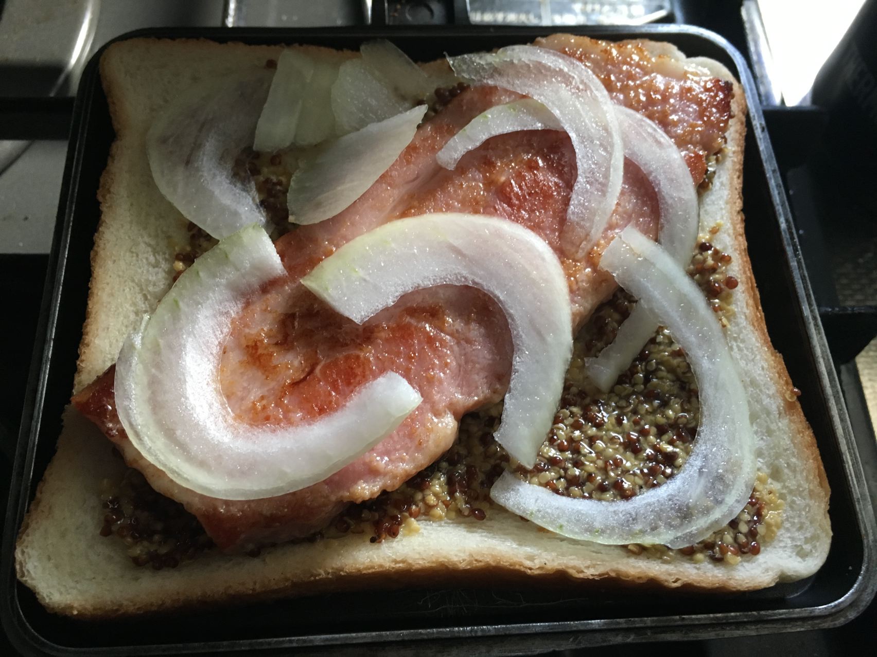 粒マスタードと厚切りハムステーキ&オニオンと目玉焼きバウルー!うみゃ〜!