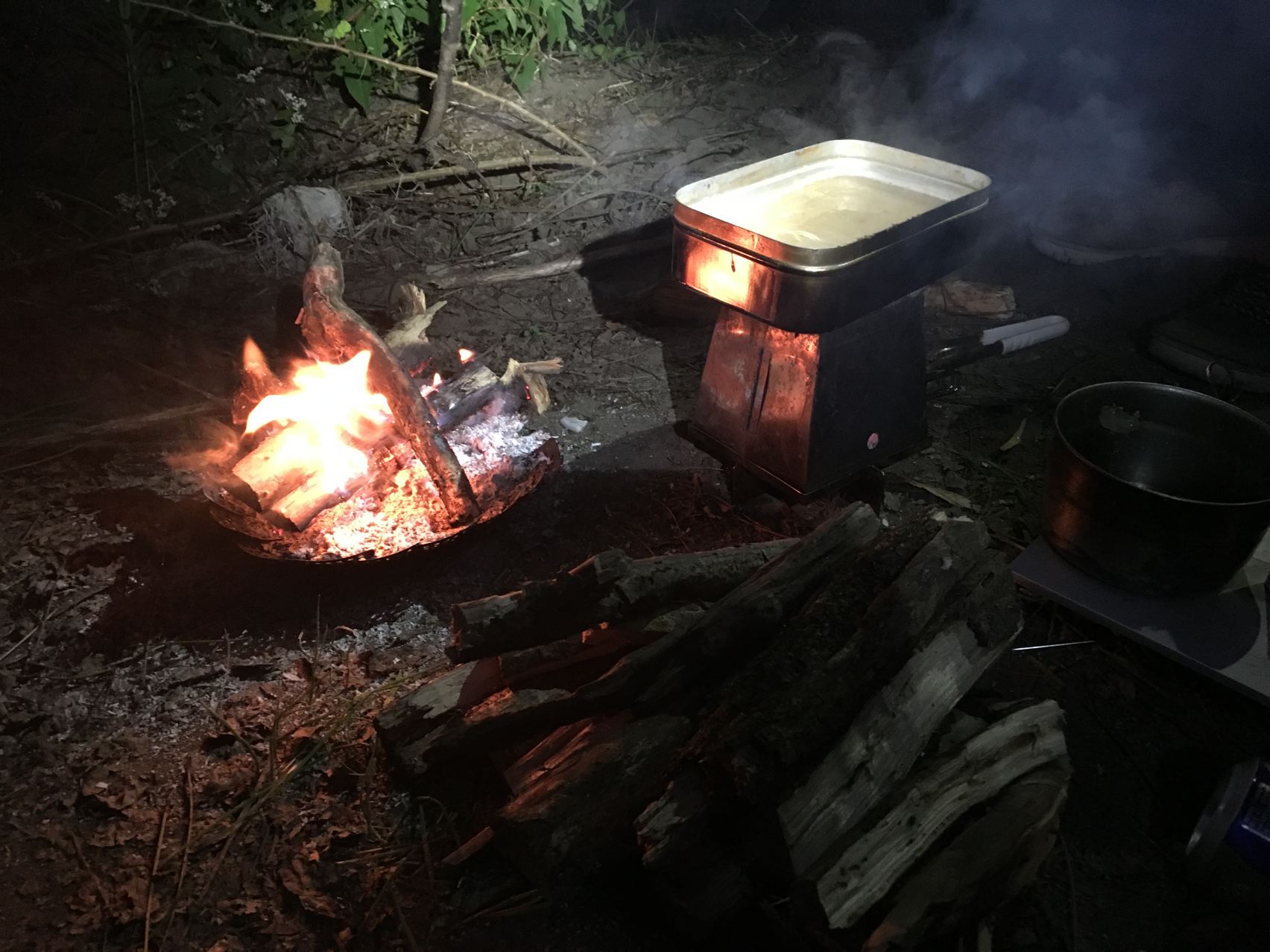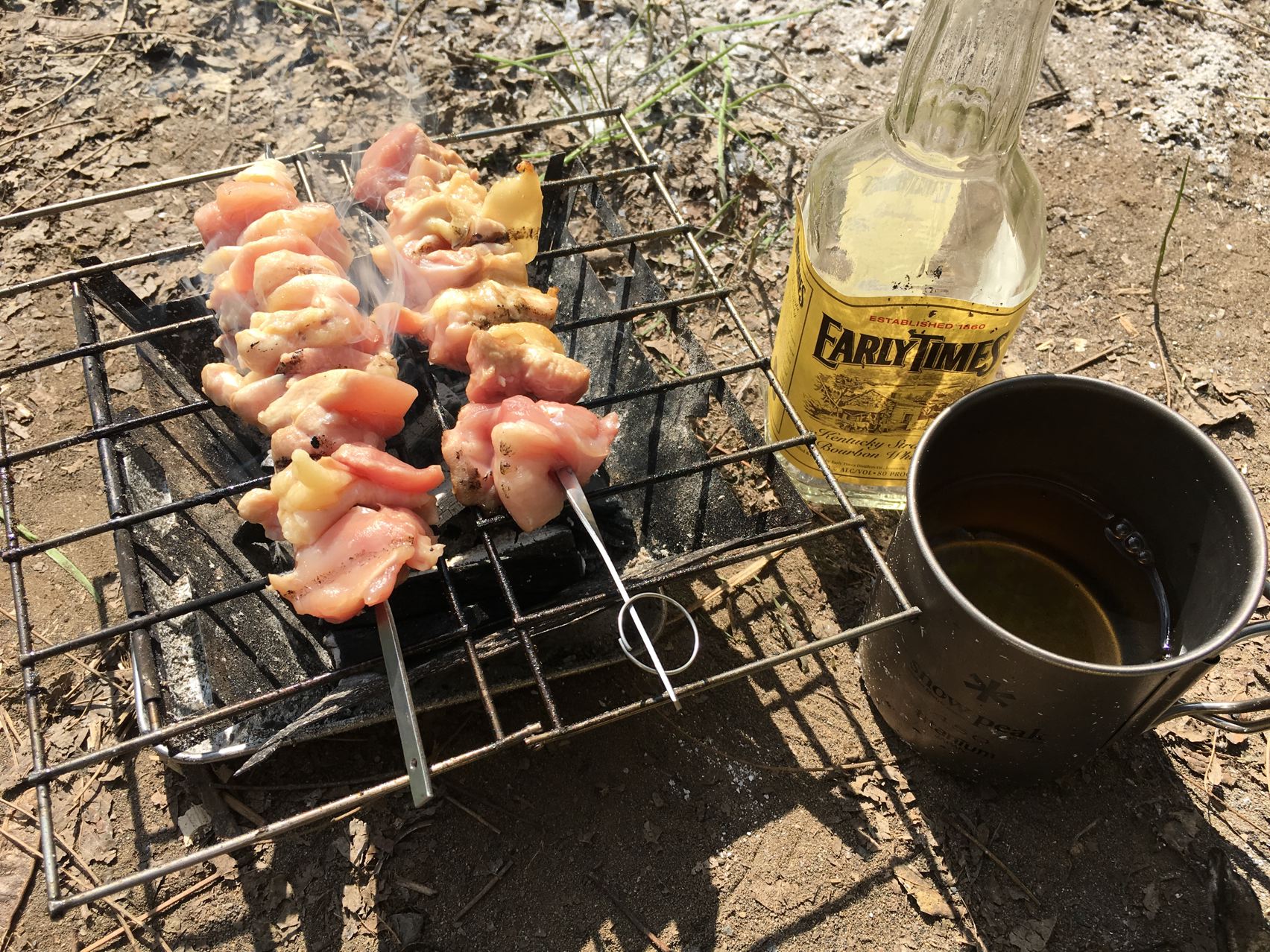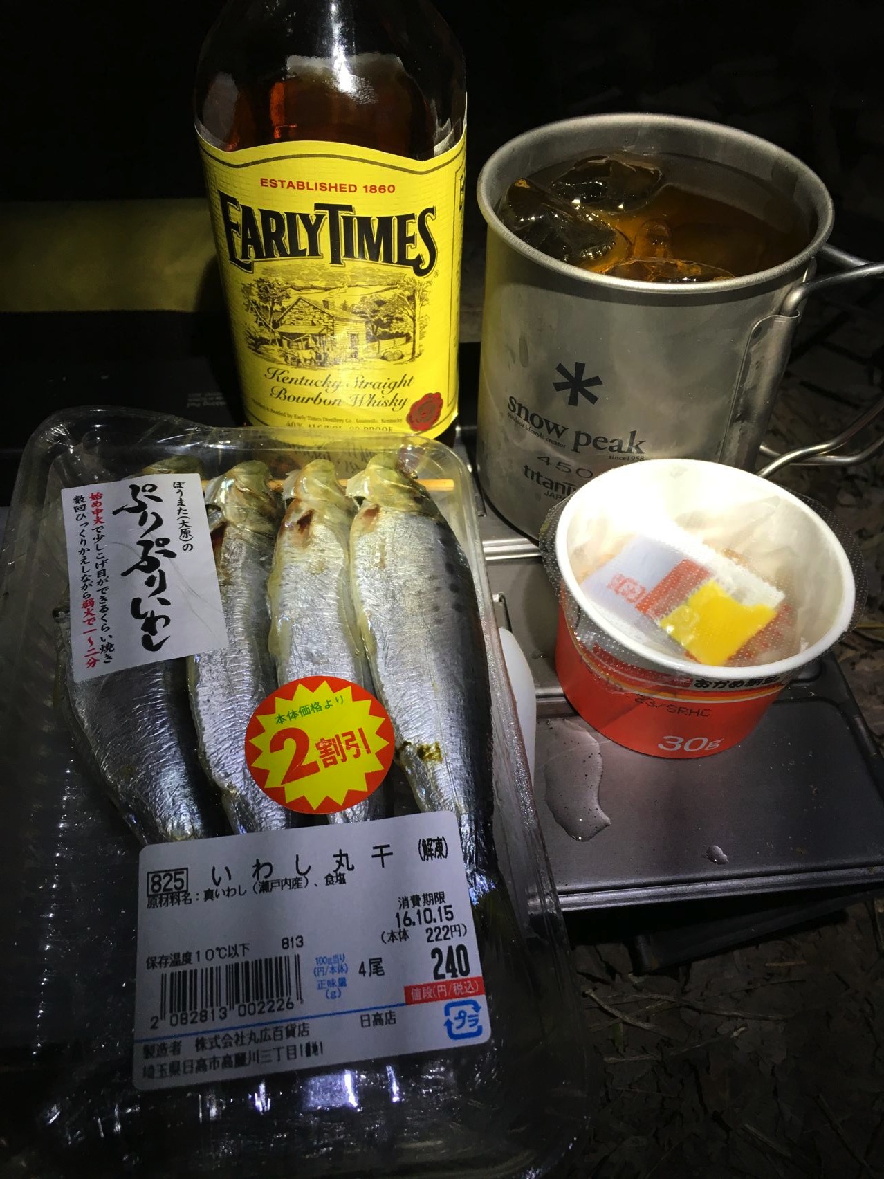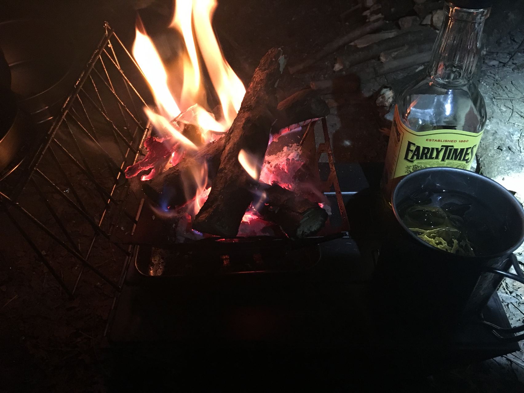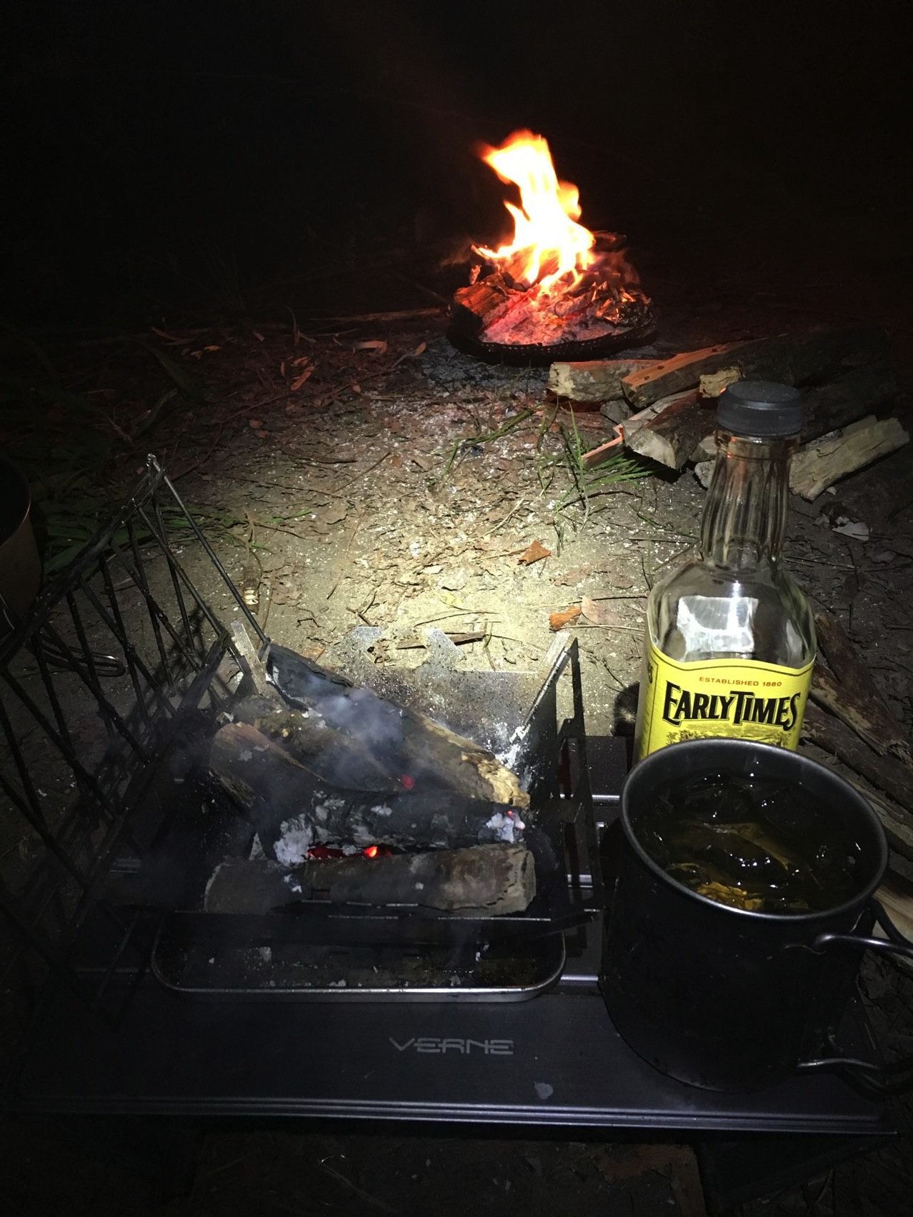 リョウさんは自作の焚火台にてひたすら焚火。そろそろ飲るか。