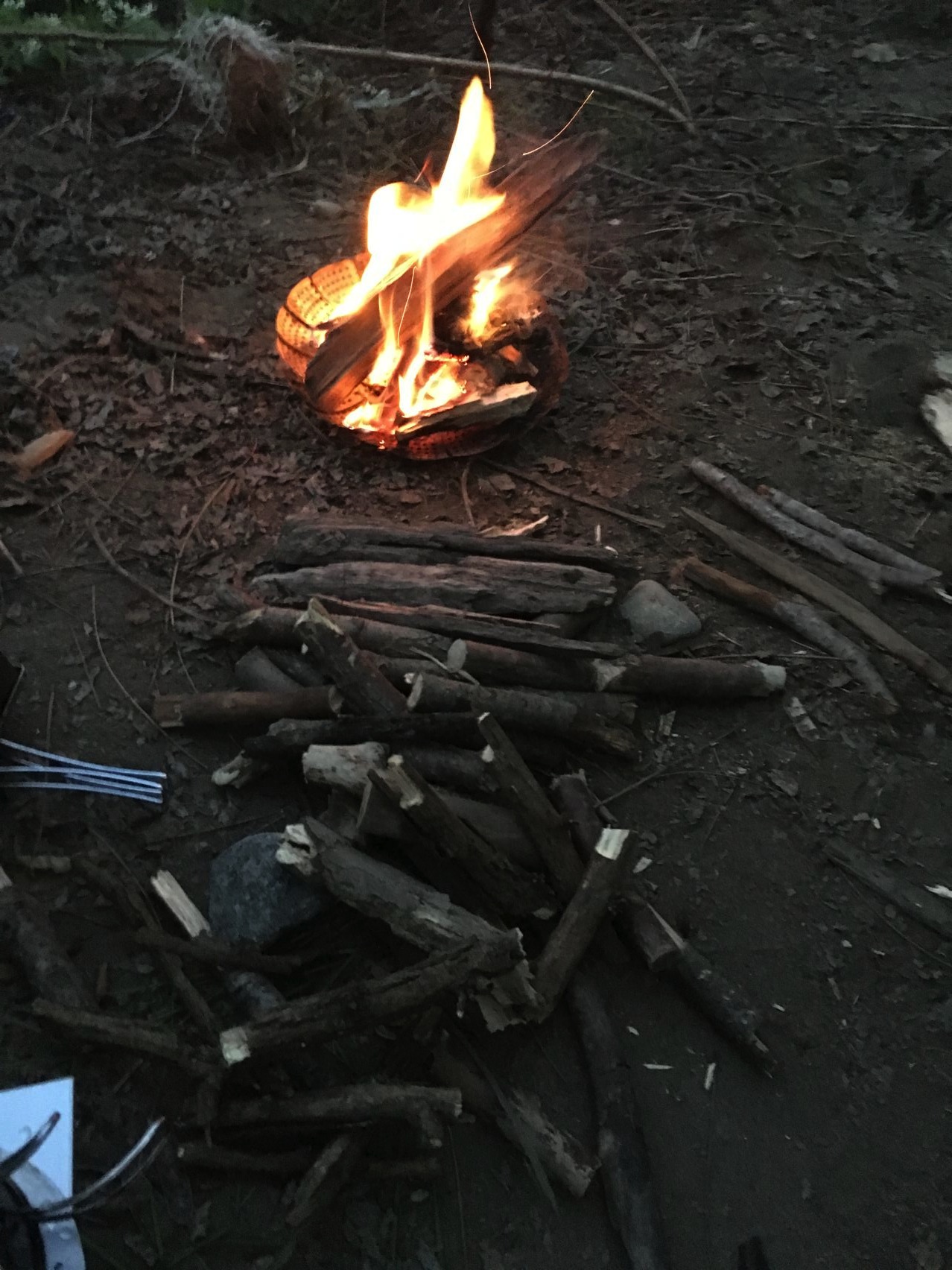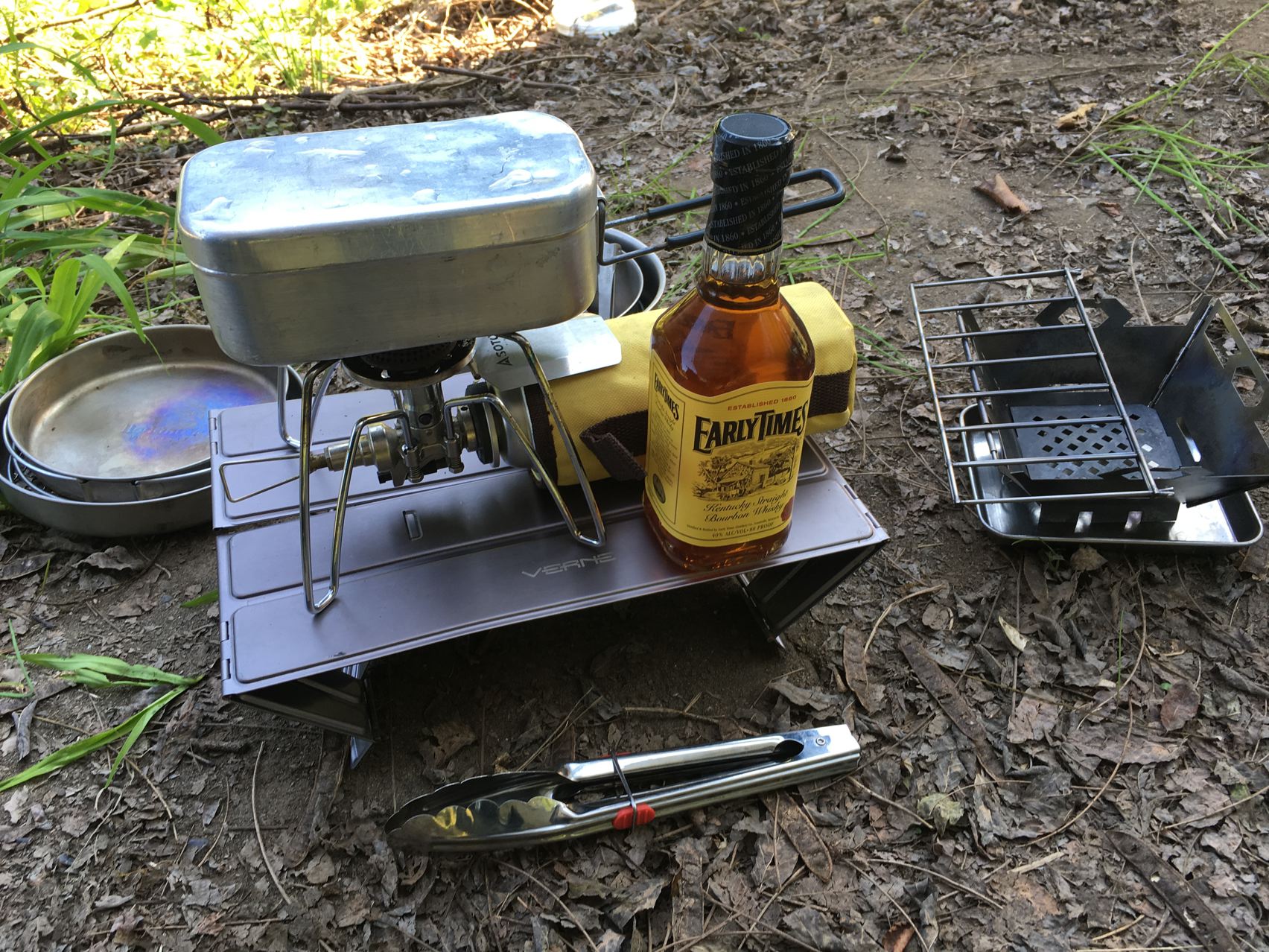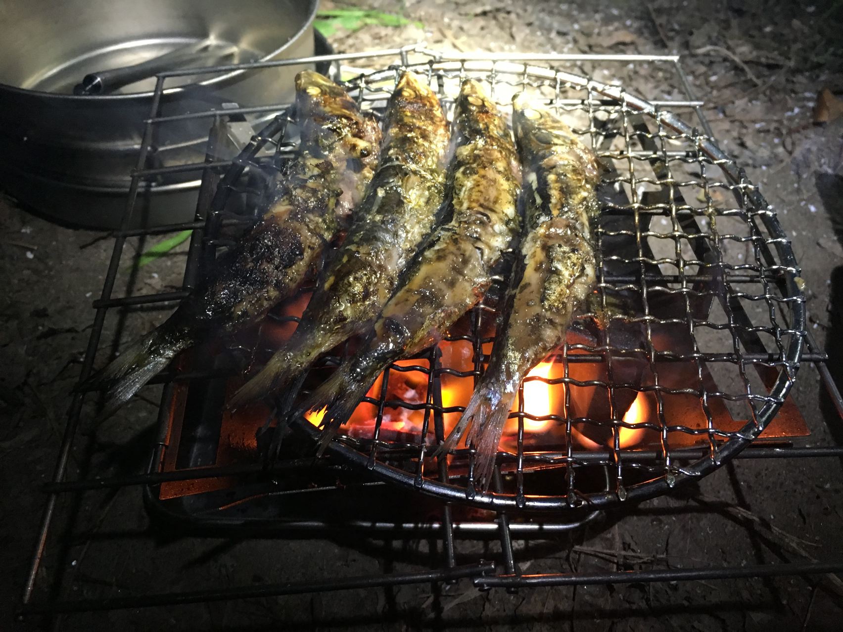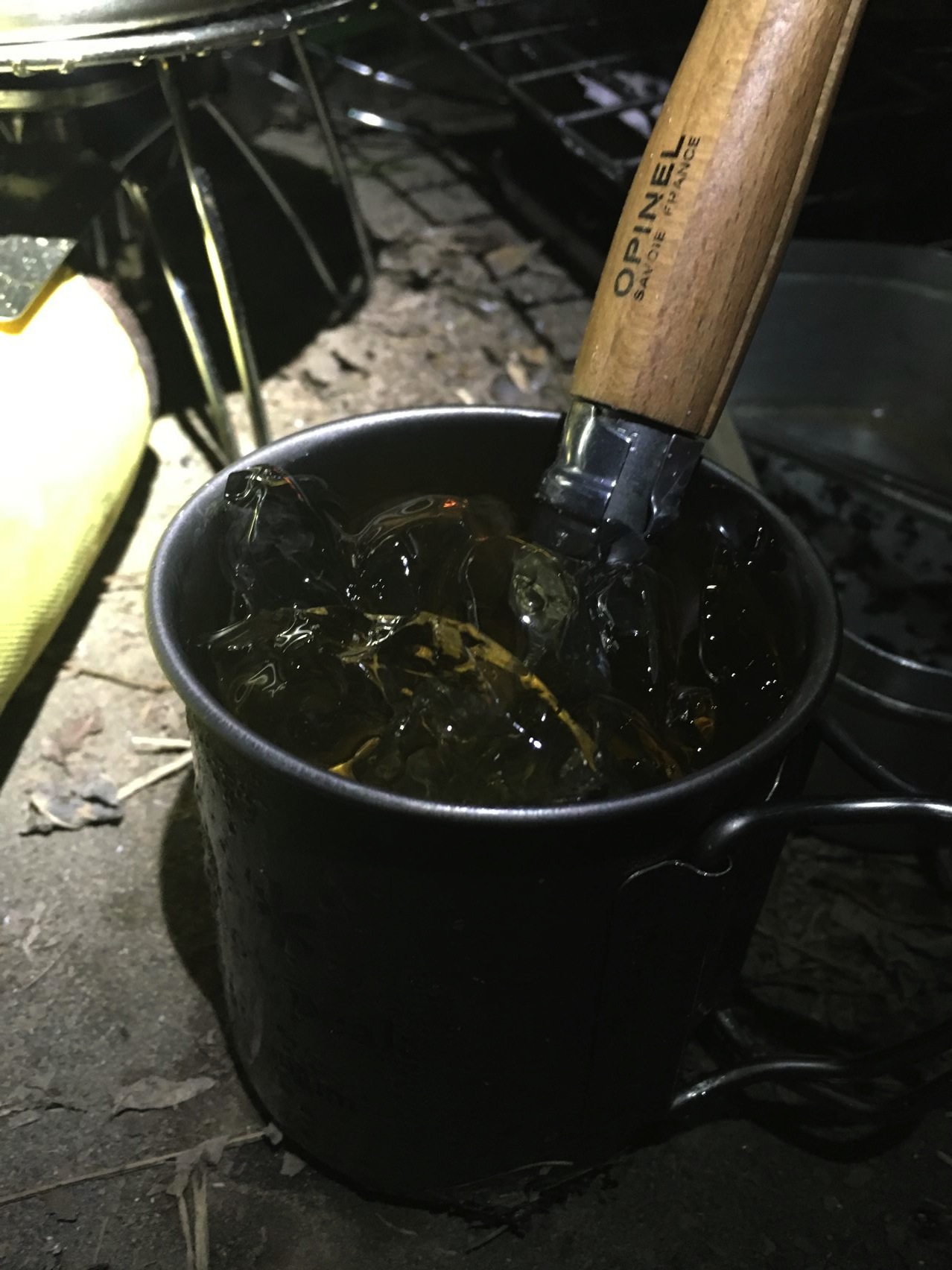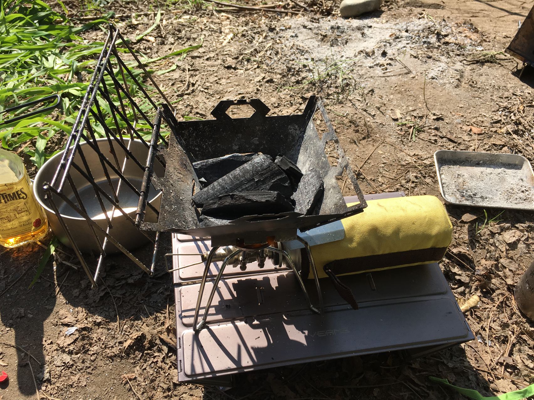 リョウさんは自作の焚火台にてひたすら焚火。そろそろ飲るか。