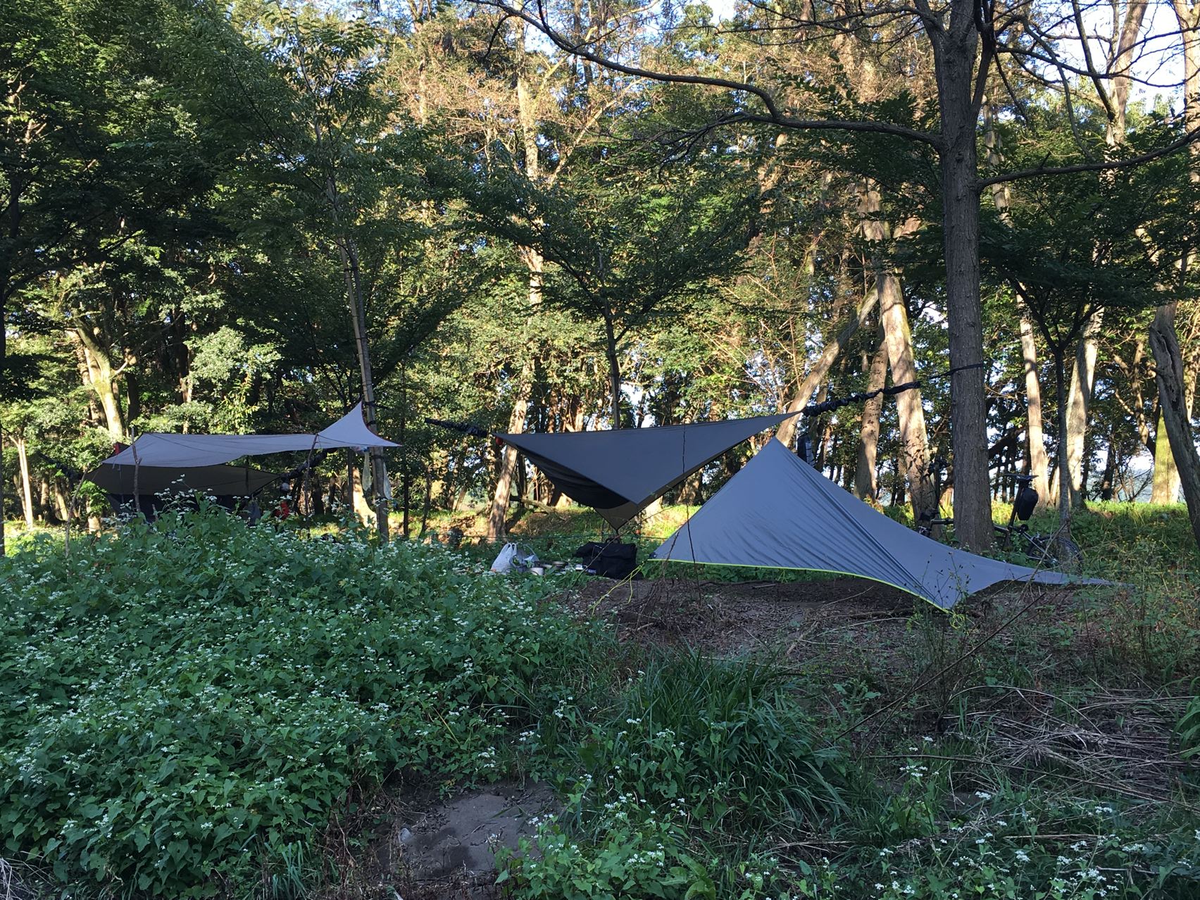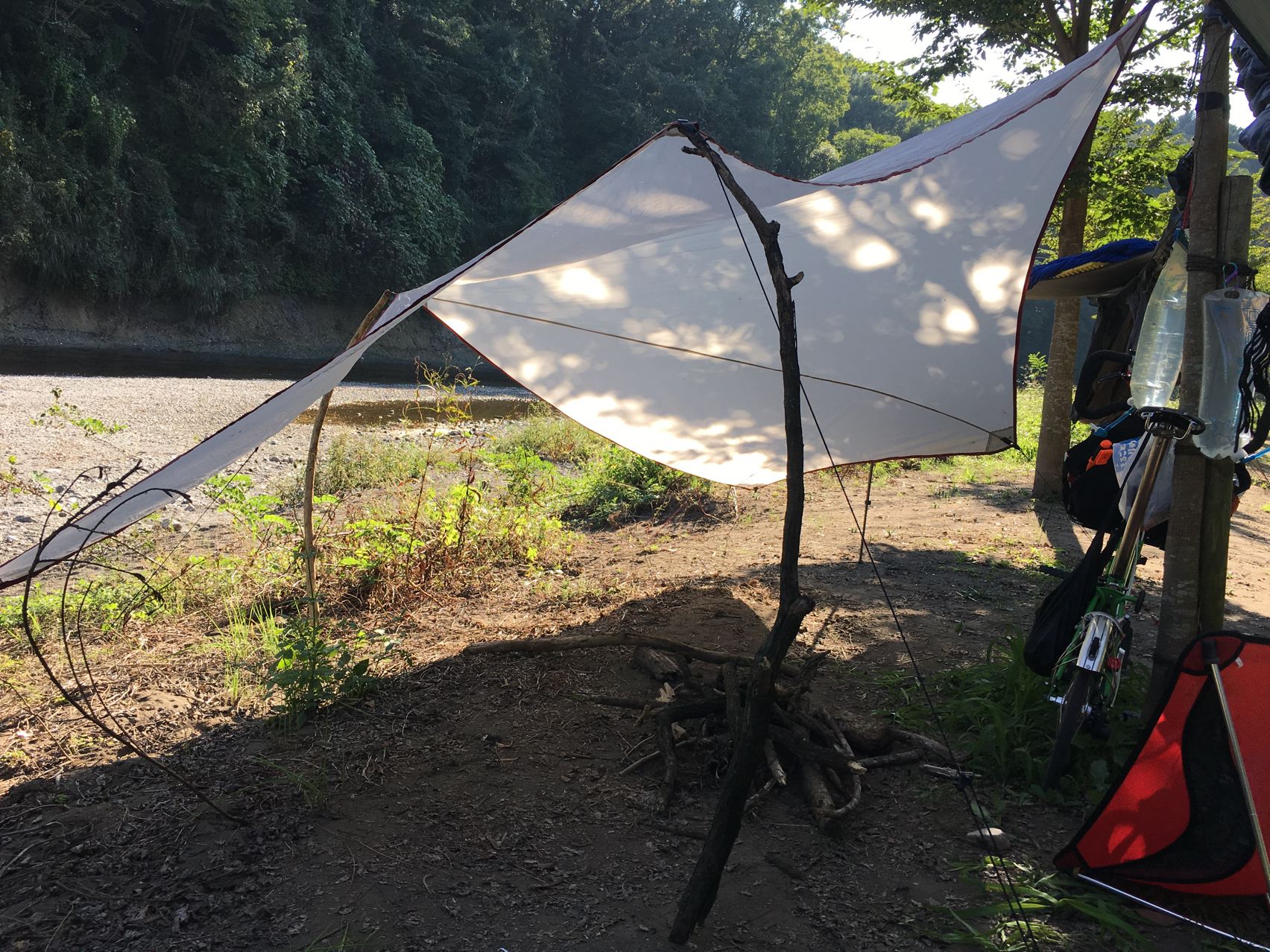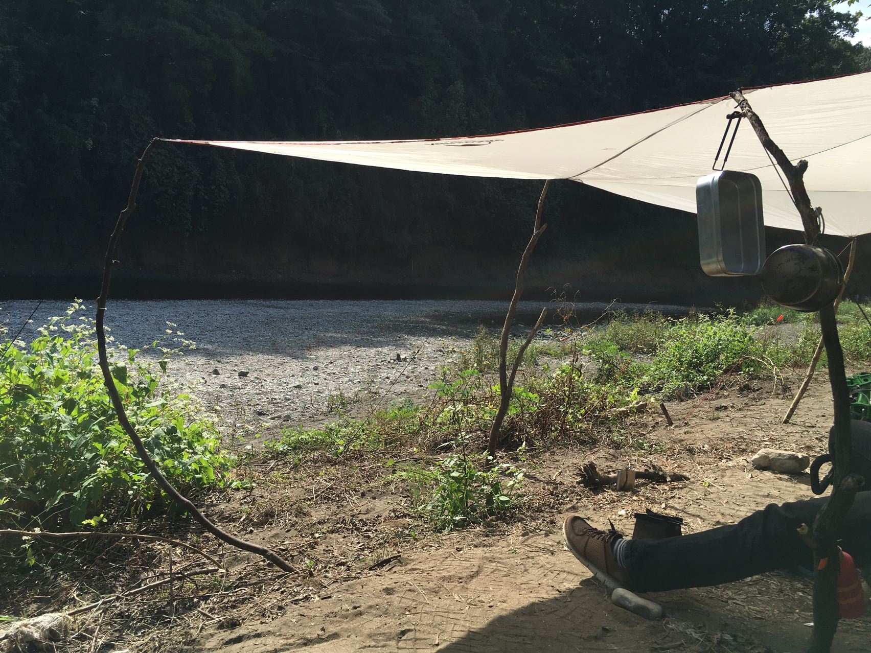 リョウさんのタープは木の枝がポールに。まさしくブッシュクラフト!
