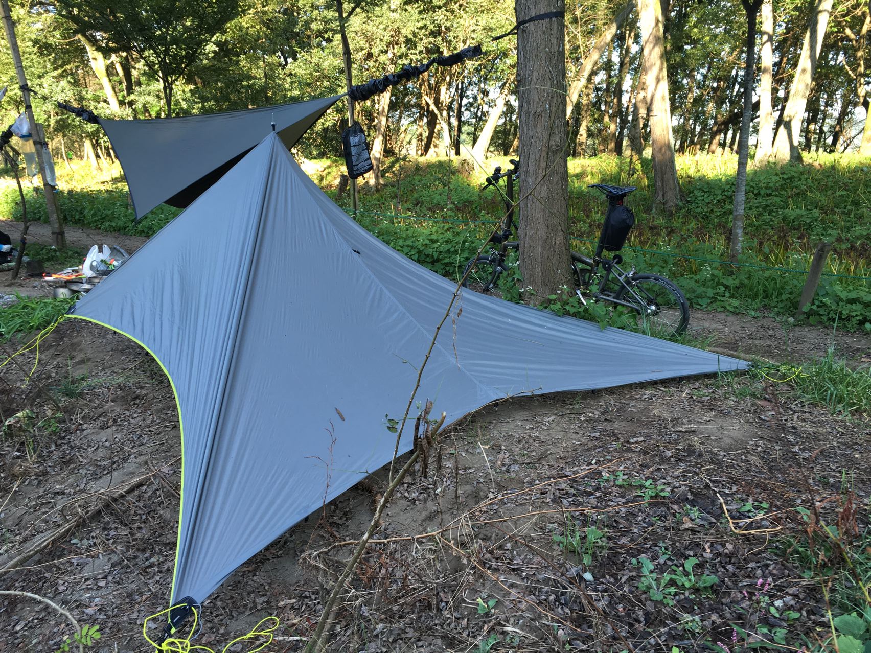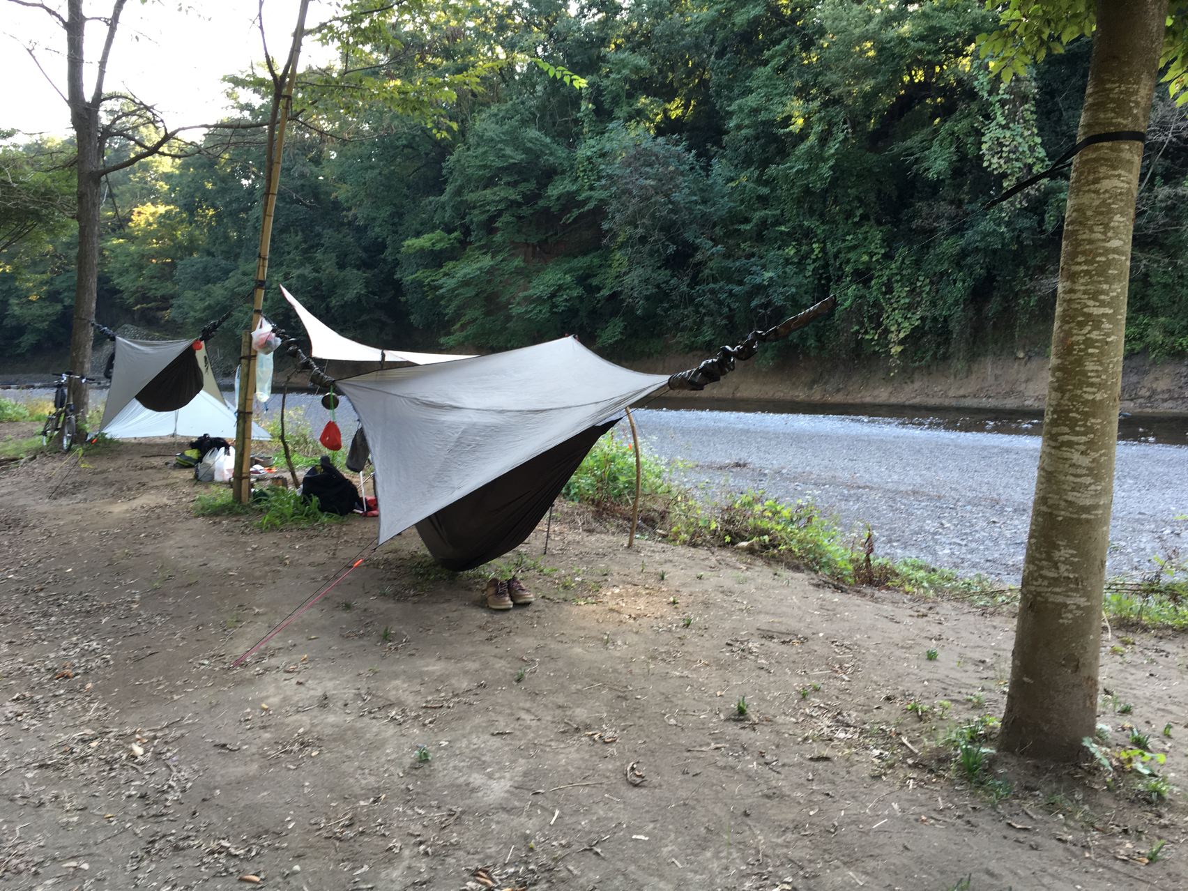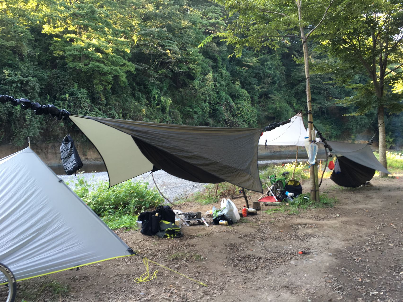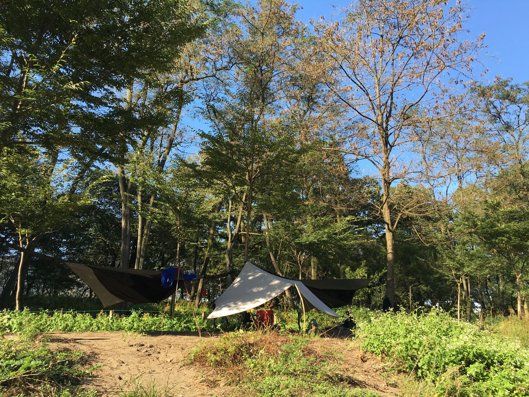 リョウさんのタープは木の枝がポールに。まさしくブッシュクラフト!