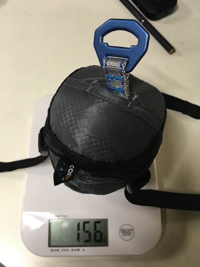 ハンモック本体と袋で156g。やっぱりアルミ金物分重たいのかなぁ